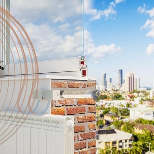 Под окном, за батареей в стене есть выступ, сверху деревянный с выступающим металлическим крюком, снизу железо с дырками, с них не дует.