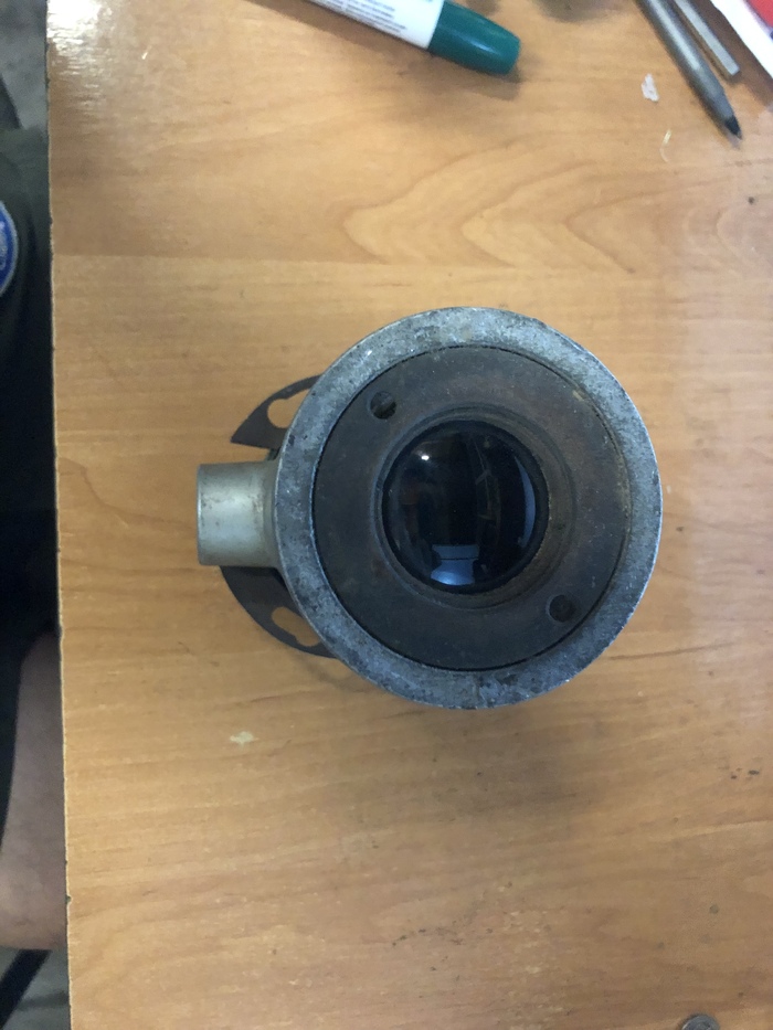 Нашли это на развалинах цехов большого производства металлоконструкций. С виду похожа на прицел, имеет большую линзу с фронтальной части и смотровой глазок с тыльной. Если посмотреть в глазок подсвечивая в основную линзу, внутри видны несколько стрелок указывающих в центр, увы сфокусироваться на них не смог. Шильдик не даёт пояснений, так как данные с него нечитаемы. В нижней части отверстие в корпус с резьбой, будто под гермоввод.