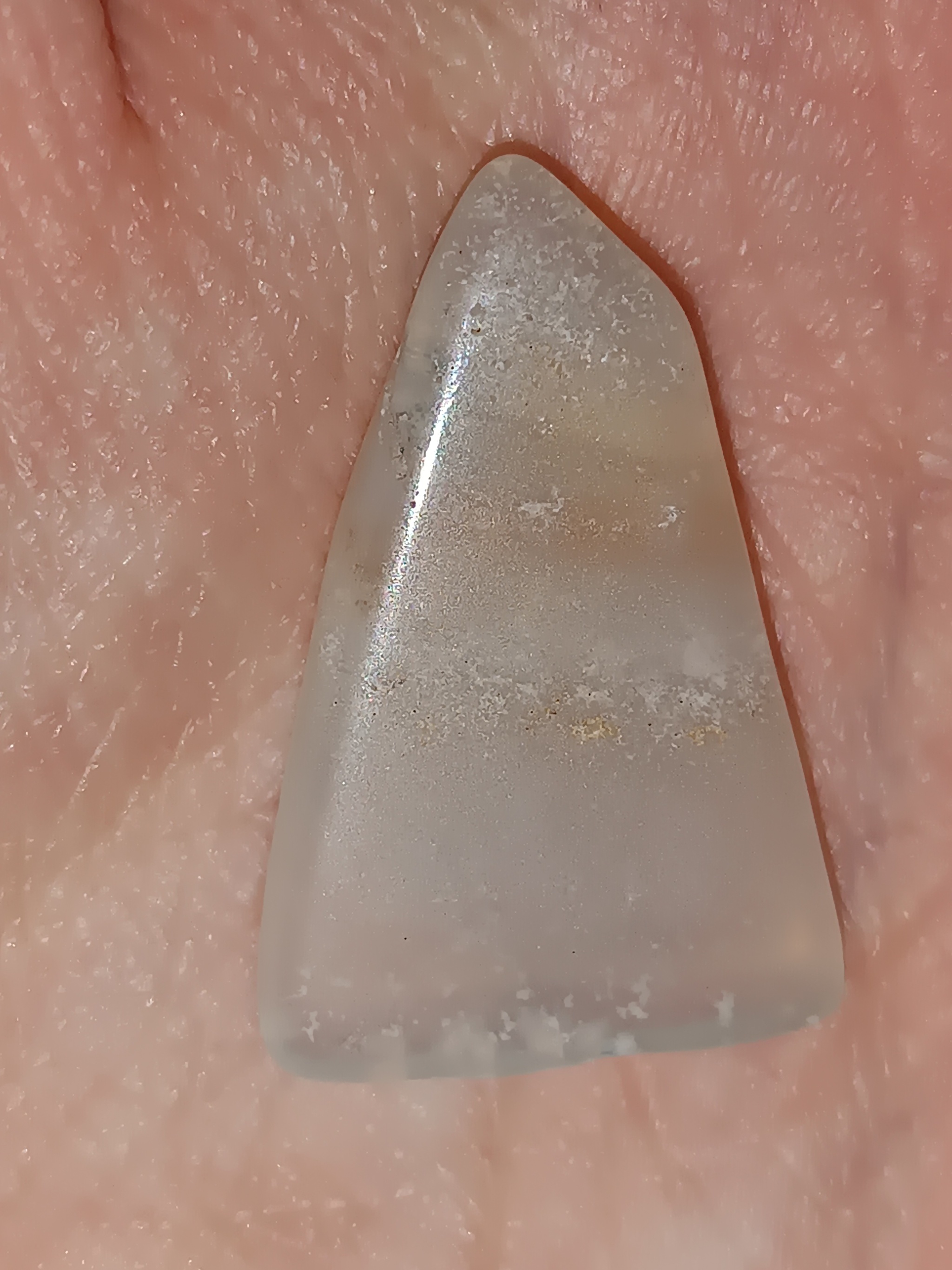 Нашёл у себя в коллекции камней данный минерал. Агатов у меня много. И крашенных полно. И настоящих. Мои предположения, что это халцедон. С включением дендритов. Потому что я царапал корундом. След остаётся. Если бы это был опал, то он бы царапался обычной стекляшкой (потому что у него твёрдость ниже, чем у халцедона и агатов).