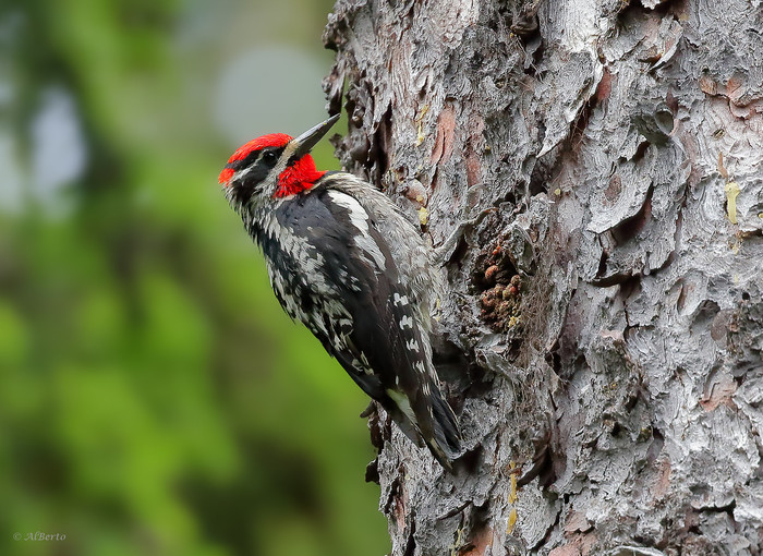 Красношапочный дятел-сосун. Дятлы-сосуны обитают в Северной Америке. Название они получили из-за способа питания - они продалбливают дырки в дереве и высасывают древесный сок вместе с насекомыми.