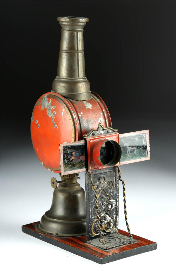 Это стекло для "волшебного фонаря" - аппарата для проекции изображений. Данный экзмепляр, вероятно, с 1920-х годов, но в целом, фонарями пользовались с 17 века. Как считается, придумал его Христиан Гюйгенс, нидерландский ученый (1629-1695) и его изобретение распространилось по всей Европе. Логика работы такая же, как у диапроектора, если у вас такой был - горит лампочка и изображение видно на стене. До лампочки, конечно, горела лампа, керосиновая или масляная.