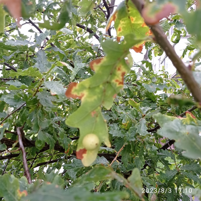 Внимание привлекли дубы. Очевидно: разные по возрасту имеют разные по количеству и размеру жёлуди. Но один почему-то не вписывался в общую картину: был выше, вероятно старше и имел много желудей, но они были мелкими и на одной плодоножке висело местами по три жёлудя. Ниже обычные жёлуди, довольно-таки крупные.