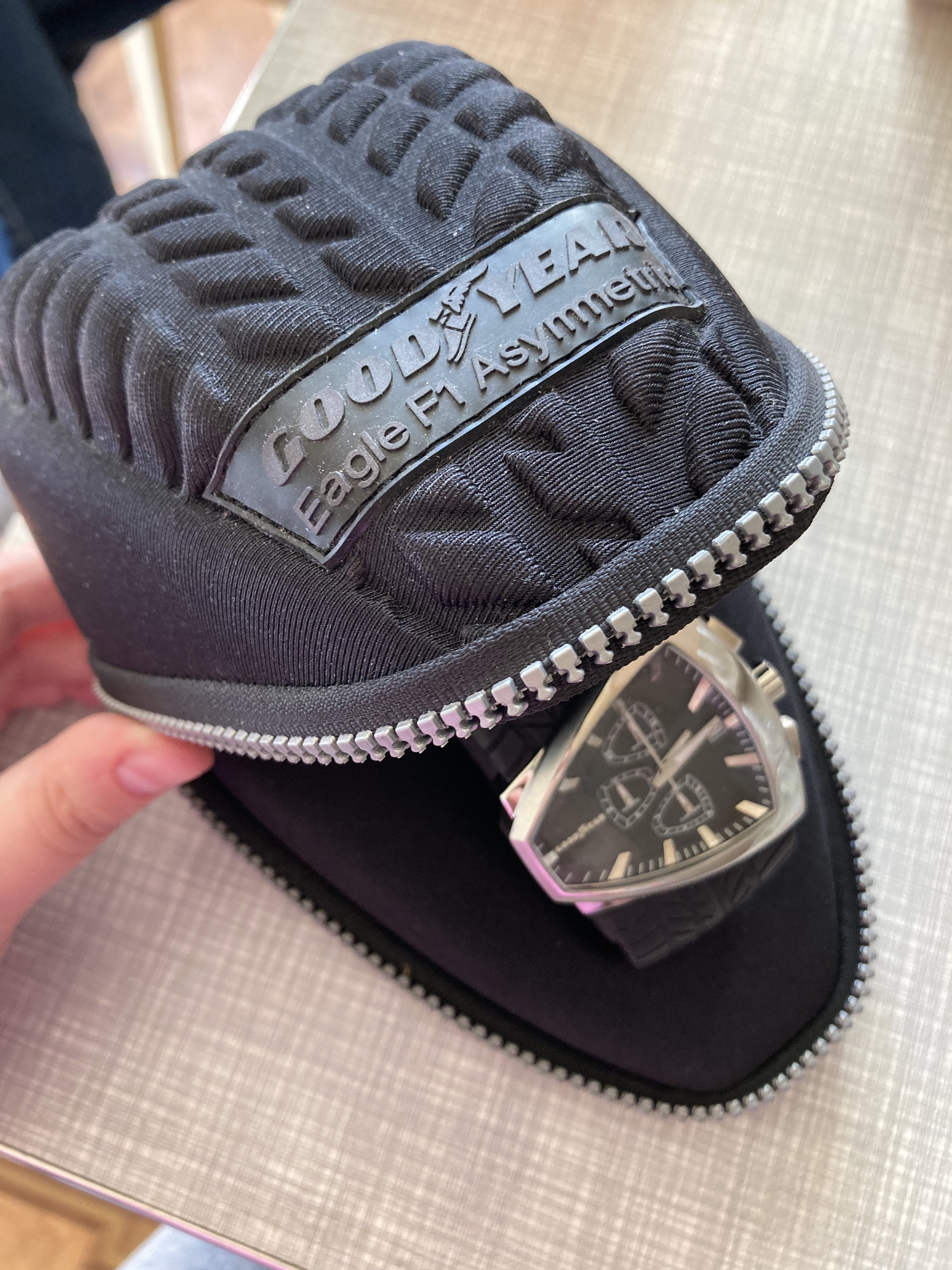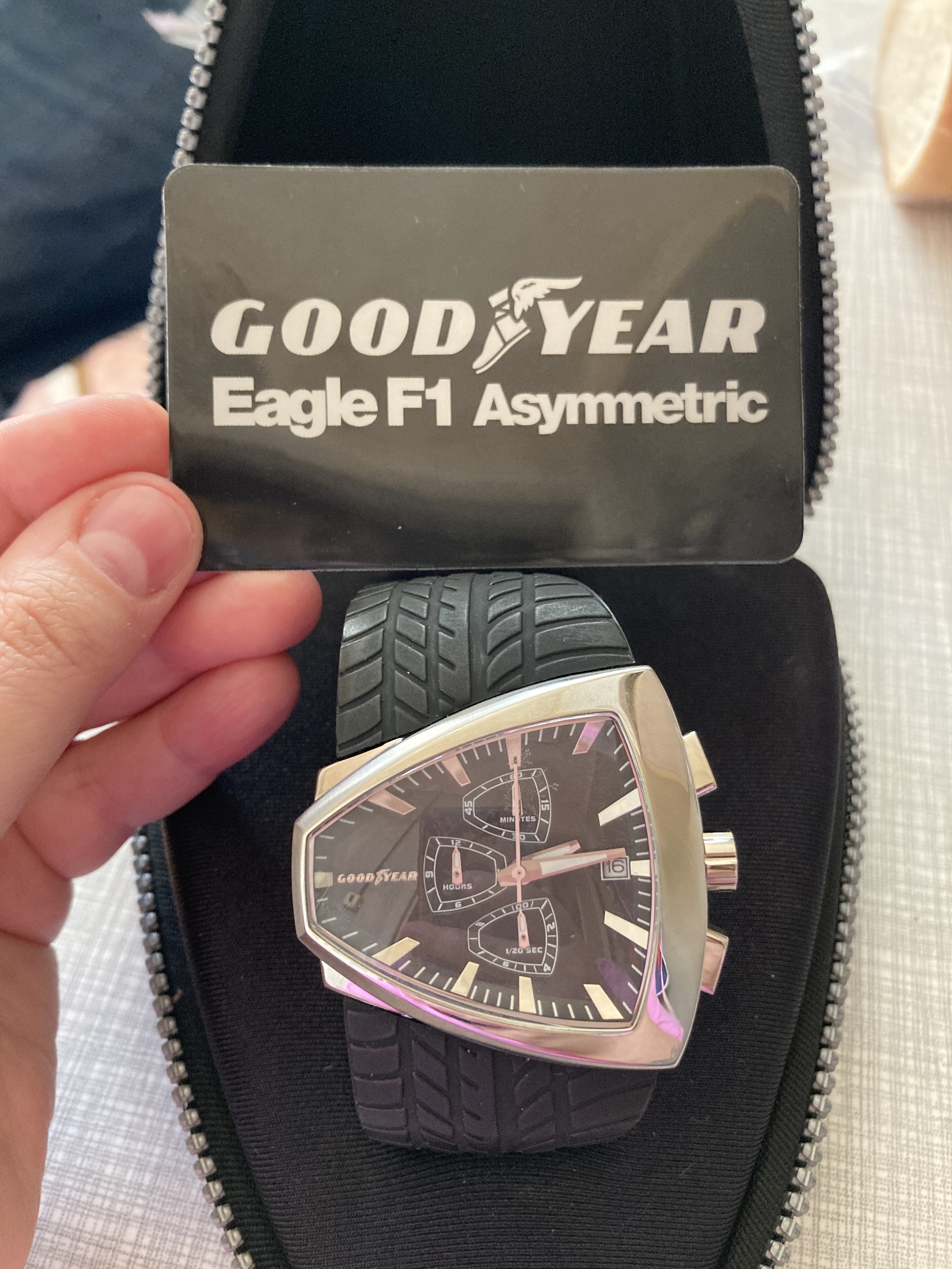 Взываю к мудрости и памяти пикабушников! Разгребая вещи почившего родственника обнаружили необычные часы GoodYear Eagle f1 Asymmetric.