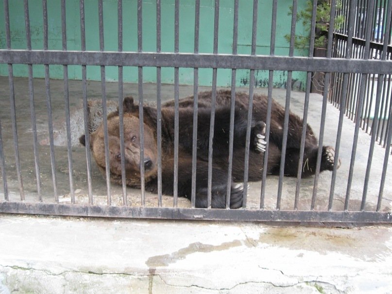 А теперь о другом мишке: говорят в глубине зоопарка есть маленькая клетка, где-то 3 на 3 метра, где сидит обычный бурый мишка. Один.