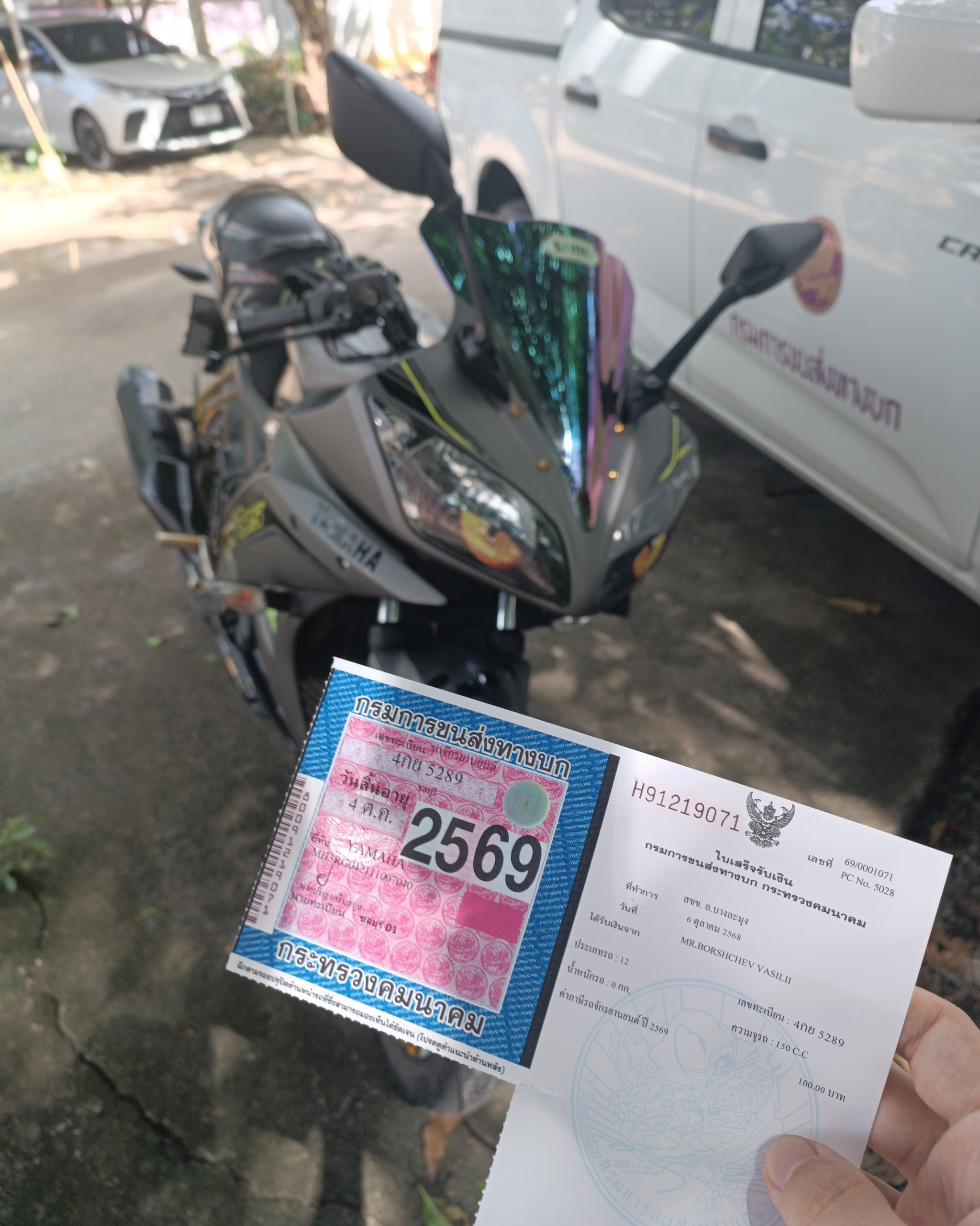 • 4฿ — копия страховки (делаю напротив DLT, кладу в байк)После этого выдают ту самую розовую бумажку, где указаны номер, дата и год. Она подтверждает, что налог уплачен, и должна быть прикреплена к мотоциклу.