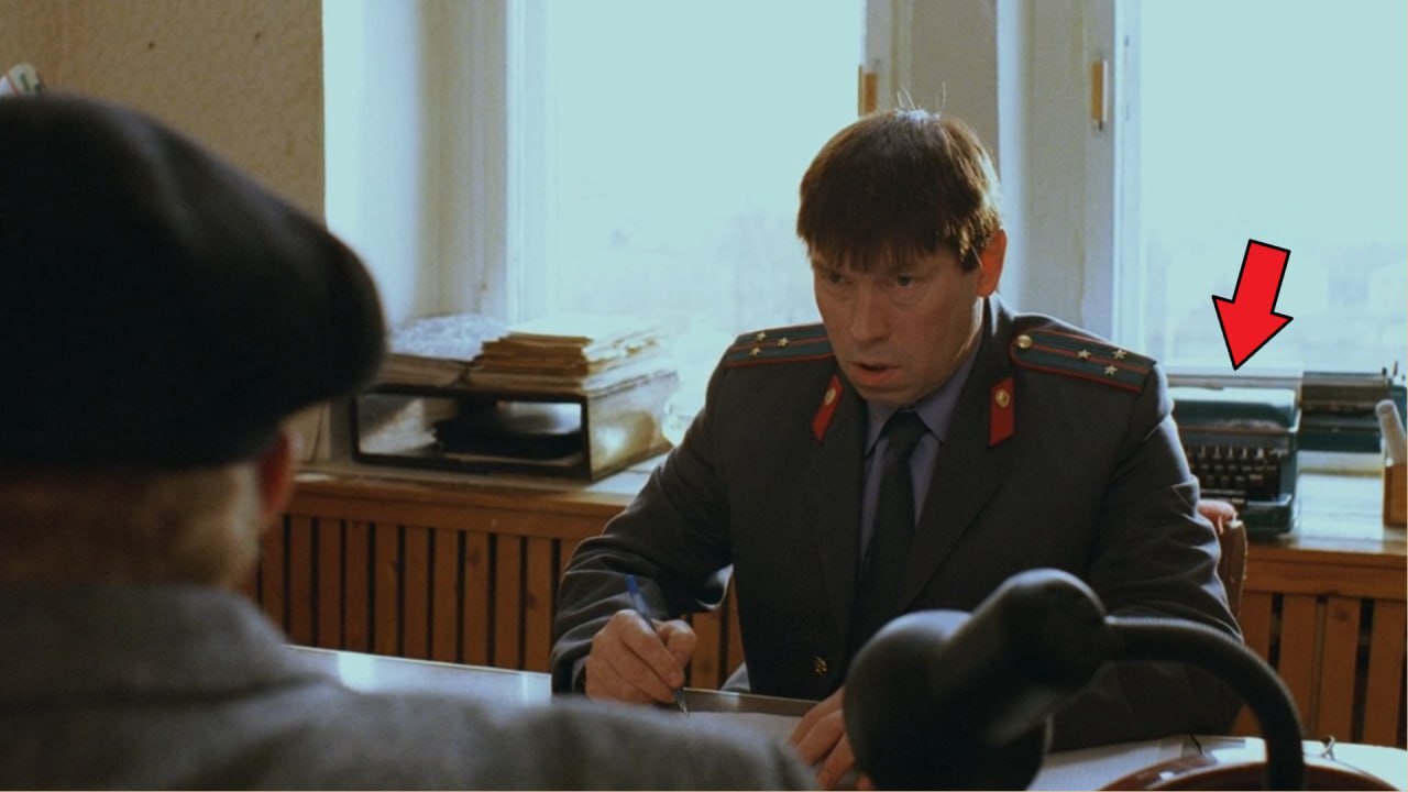 За спиной героя Сухорукова можно разглядеть печатную машинку "Украина". Являлась точной копией немецкой машинки "Rheinmetall GS" и изготавливалась ещё в 1950-ых годах.