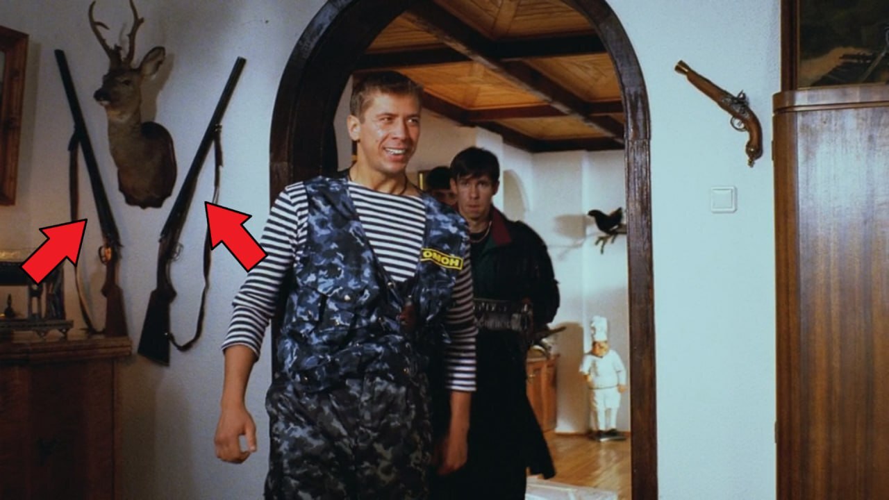 Персонаж Дюжева использует хитрое приспособление для быстрого выхватывания пистолета. Пистолет можно спутать с "Макаровым", но на самом деле это Walther PP.