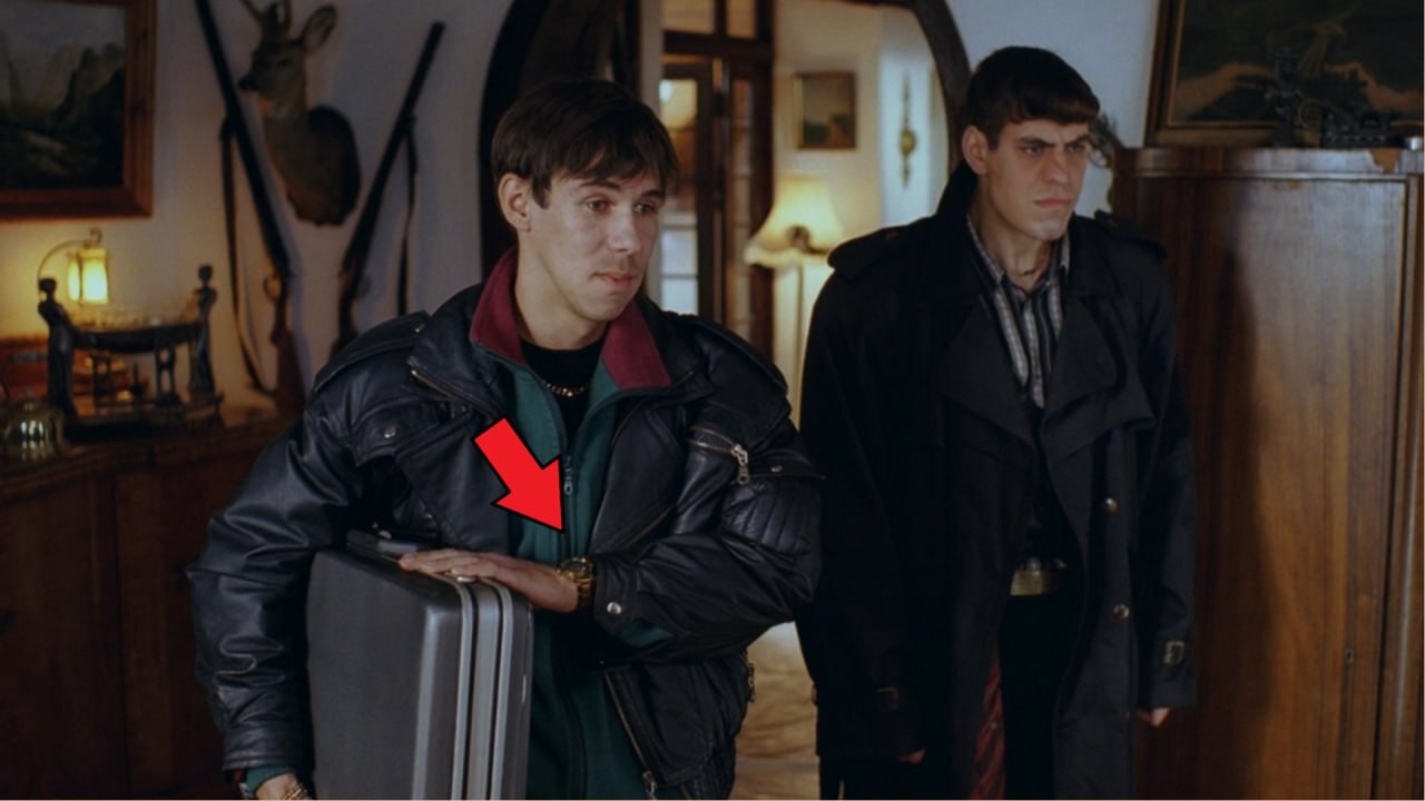 Герой Панина носит на руке легко узнаваемые часы "Командирские". Первые часы этой марки появились ещё в 1965 году, но в 90-ых продолжали пользоваться популярностью. Впрочем, тогда уже появились и китайские подделки.
