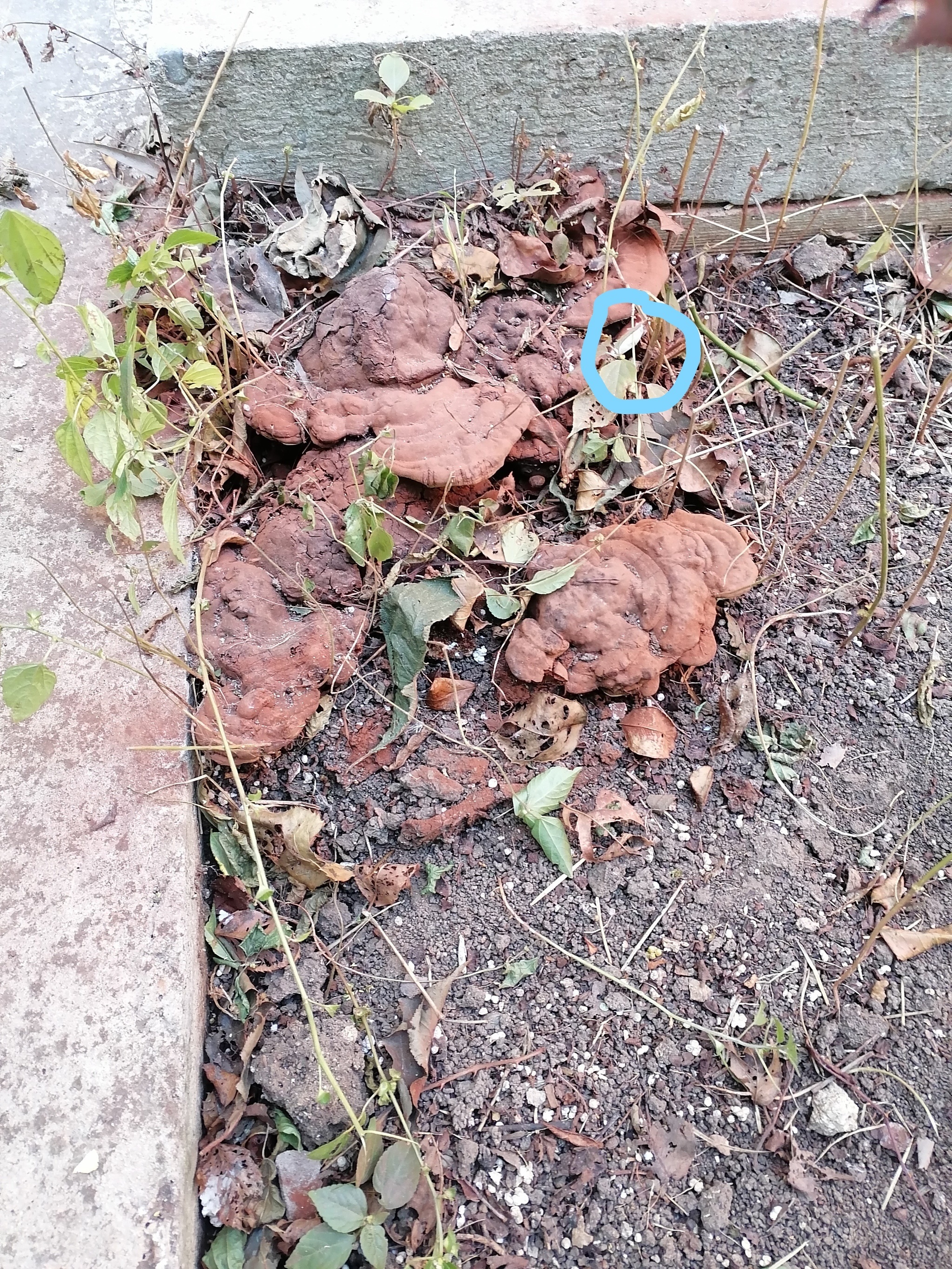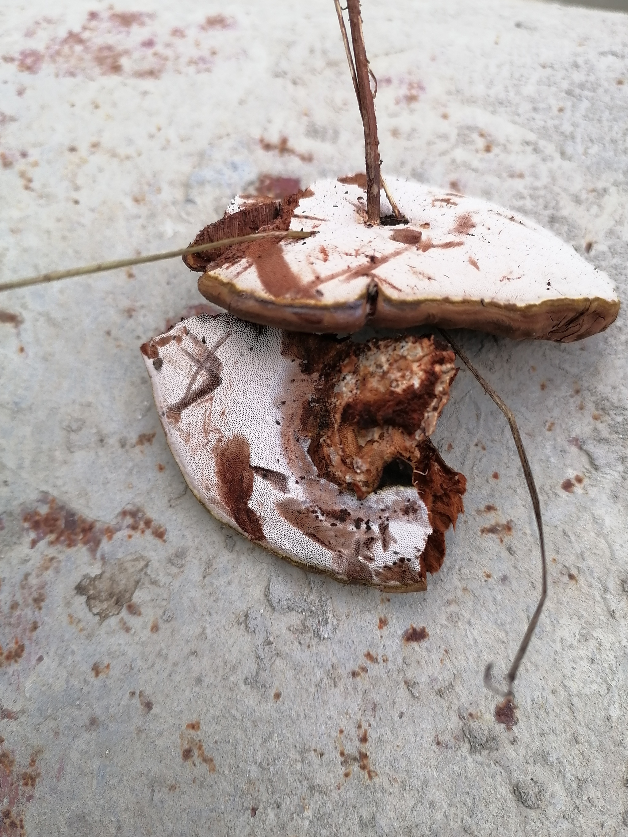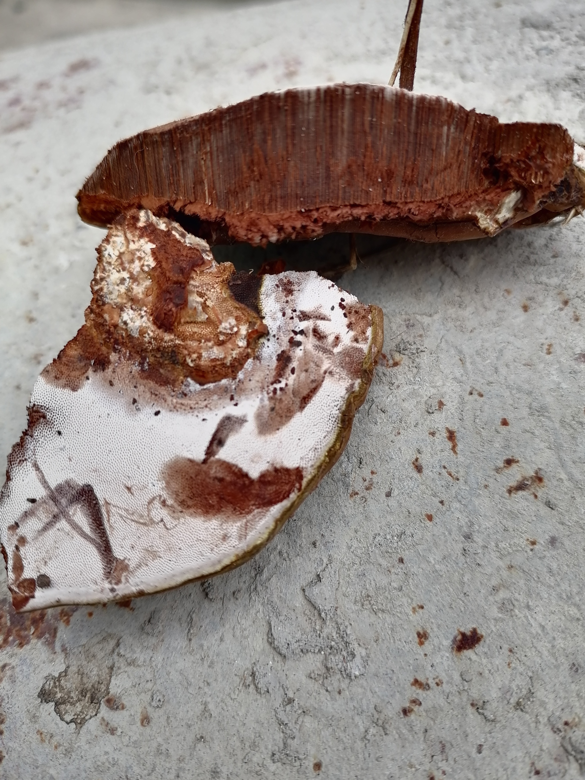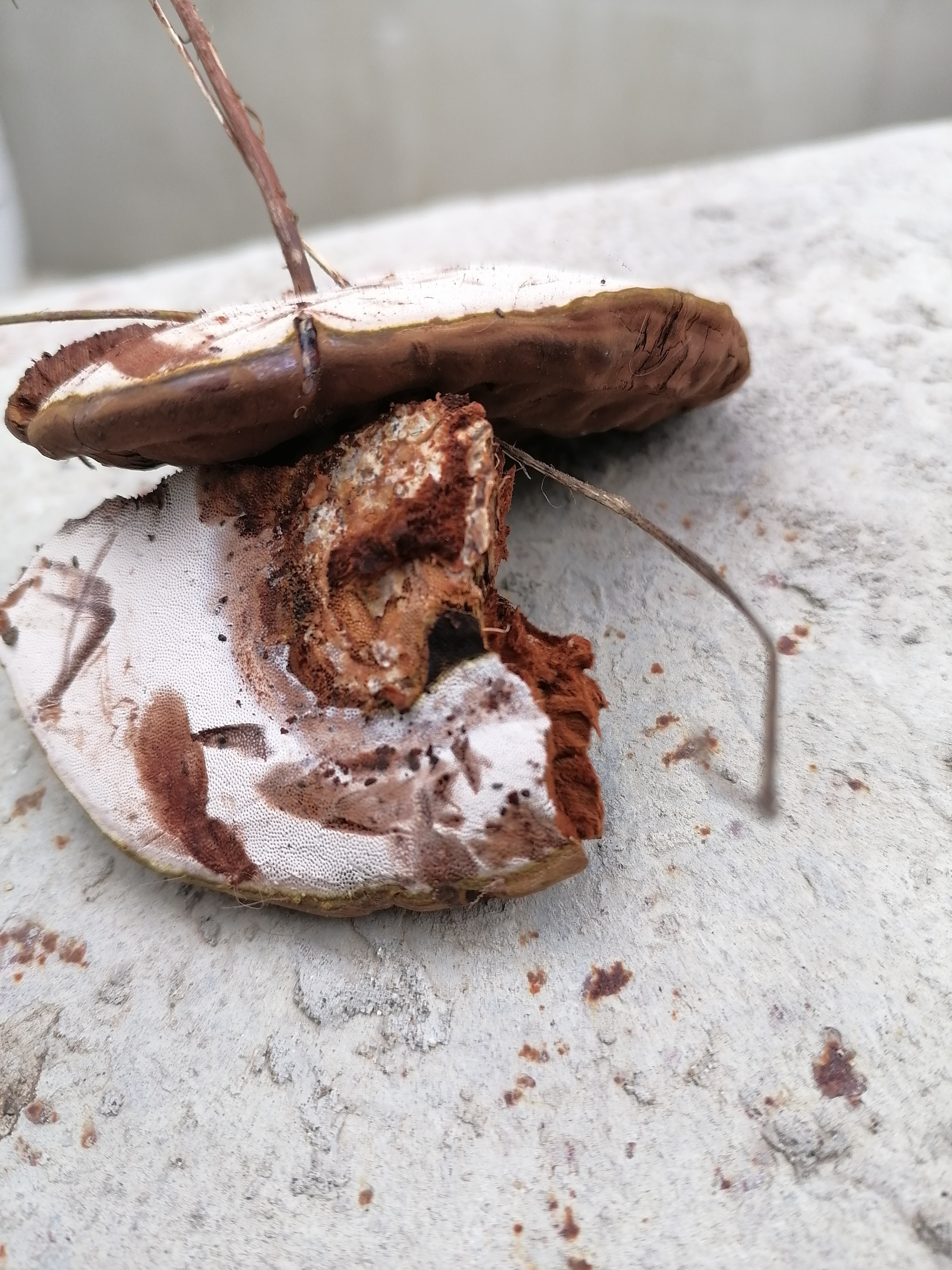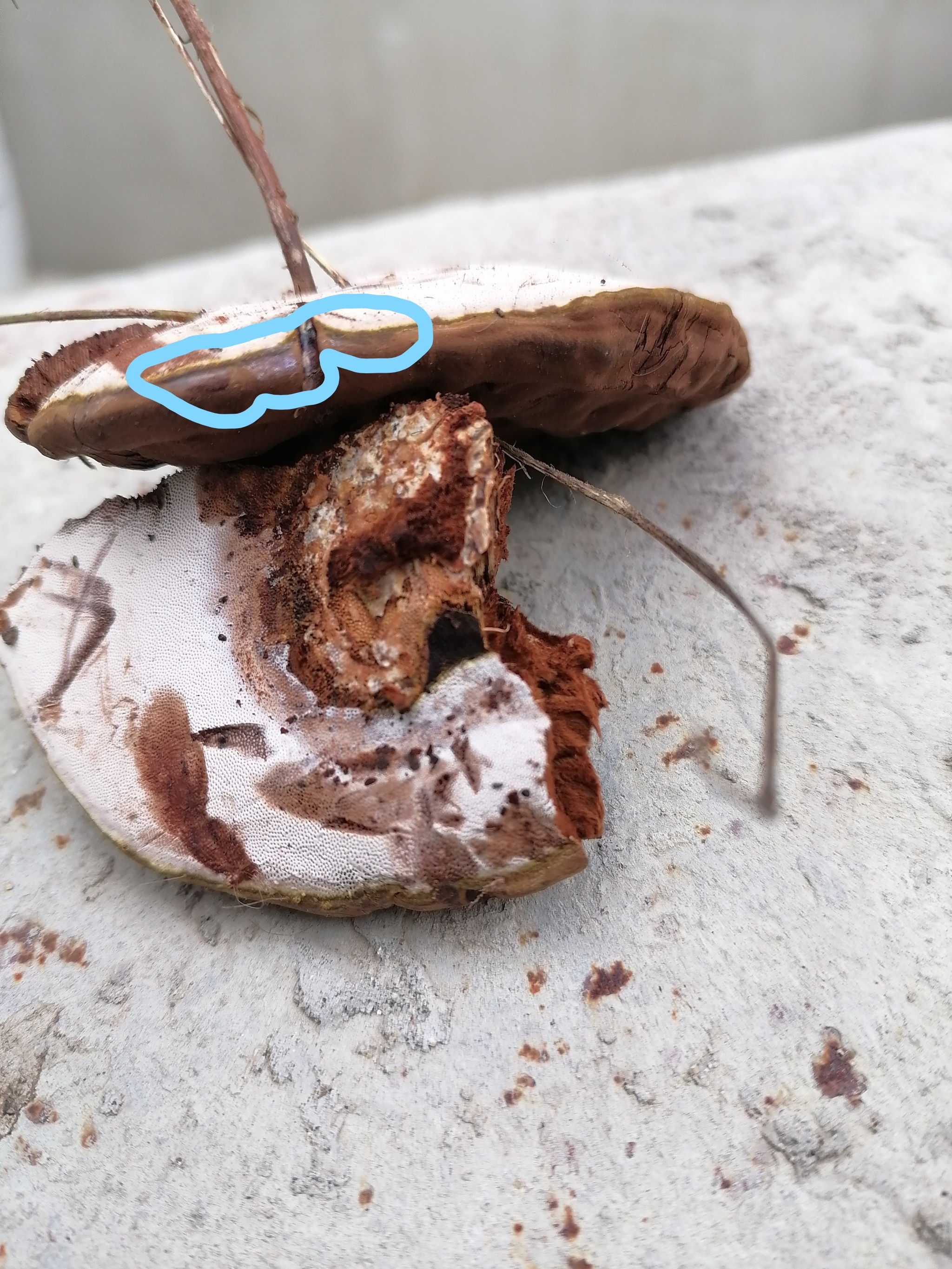 Он и правда похож на старого рейши. Отметила голубым - это более молодой гриб? У него характерная светлая полоса по краю. Посмотрите, он блестящий сверху?