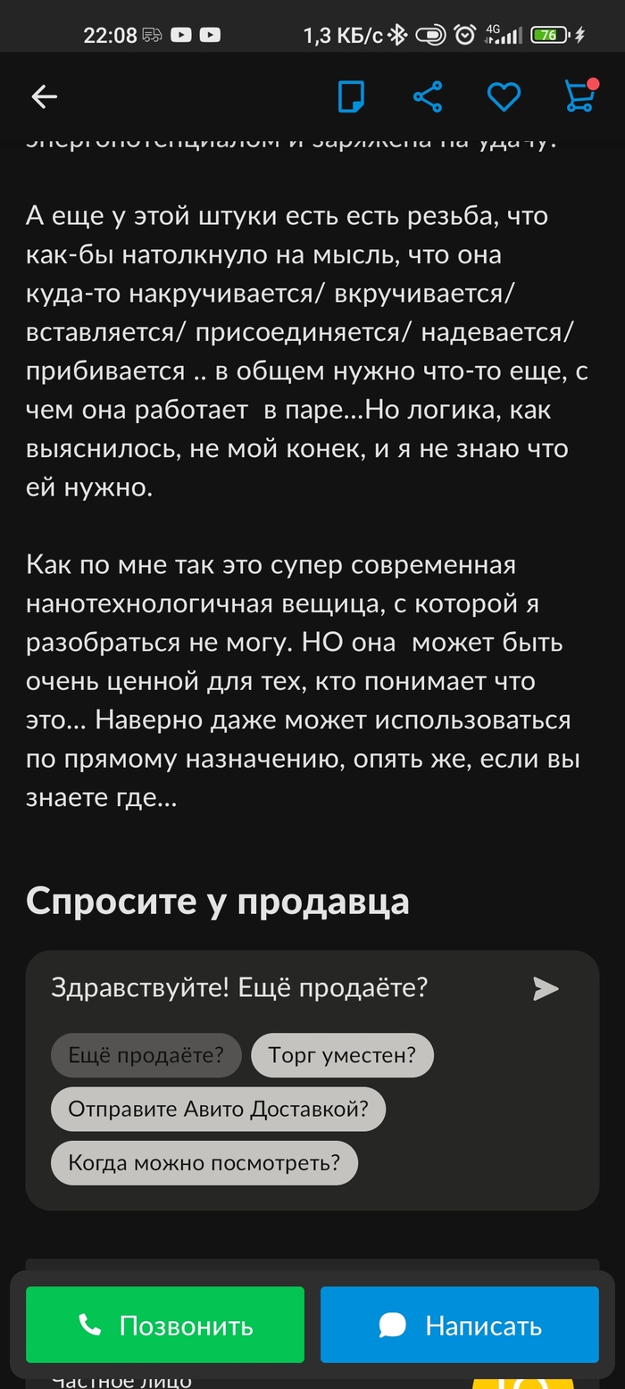 1063 DELETED Специфический юмор Что-то "нужное" на авито 2 года назад Попалось на авито. Очень уж интересное описание Авито Объявление на Авито Юмор Описание Длиннопост Скриншот 18 3 2 Ещё 0