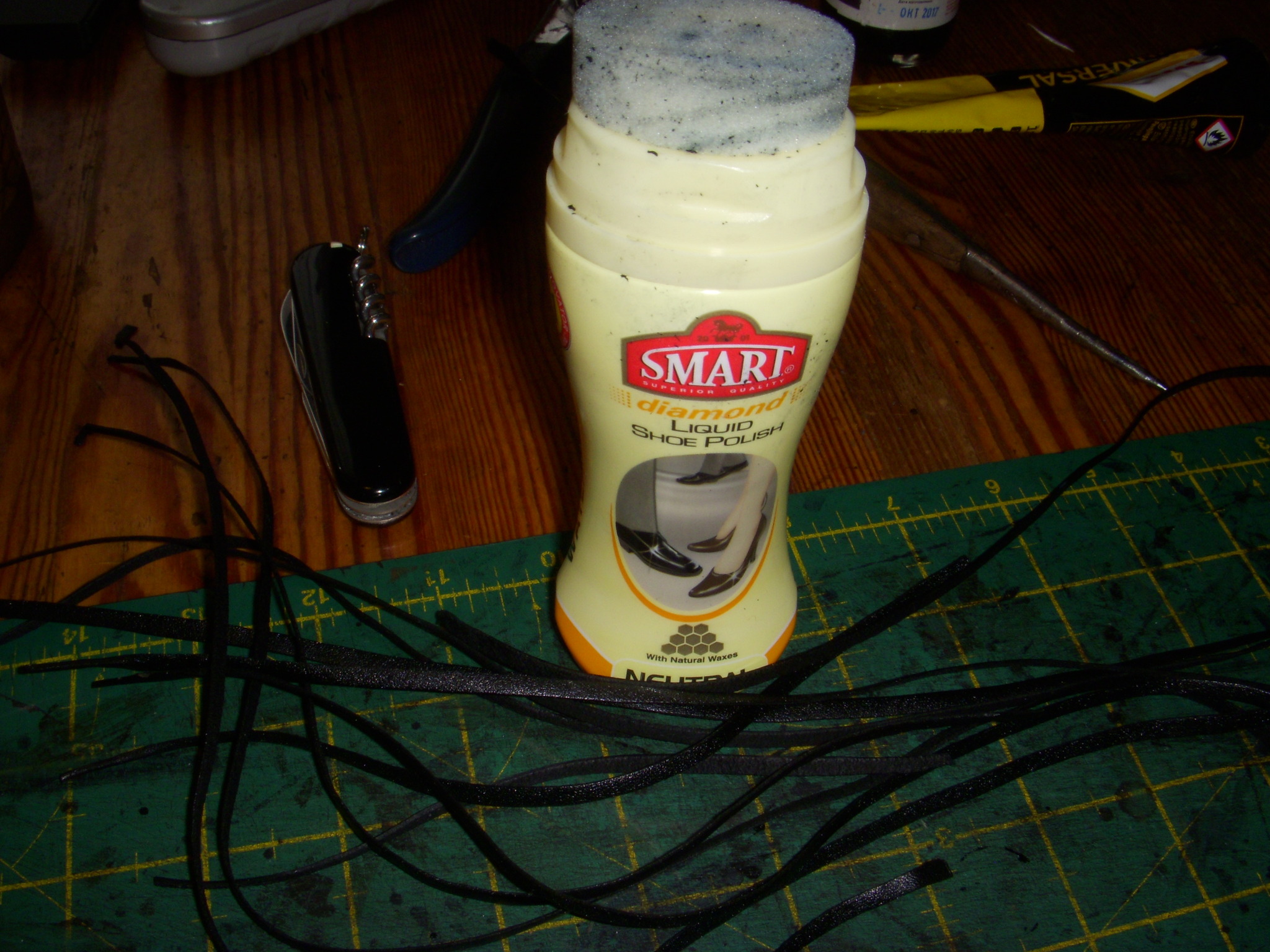 Сначала я вырезаю шнурки из кожи (ваш Кэп;). Важный момент: кожа для шнурков должна быть хорошей т.е. не рваться и не лохматиться, когда вы будете использовать шнурки вместо ниток.