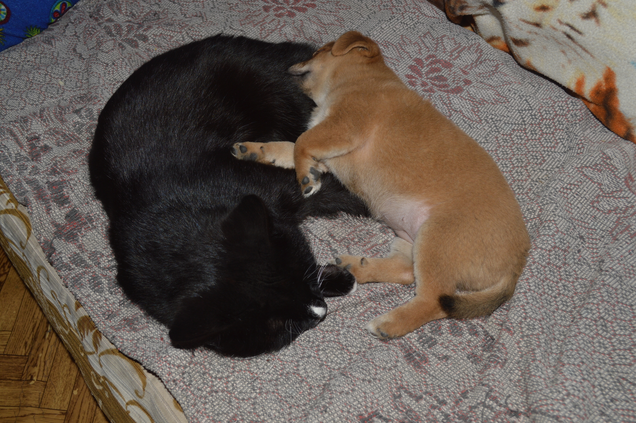 Между этими фотографиями чуть больше часа, герои (кот и щенок) одни и те же.
