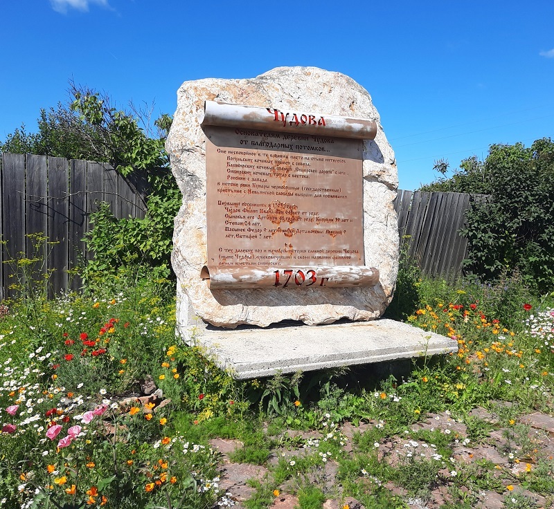 «Основателям деревни Чудова от благодарных потомков… в истоке реки Кунары черносошные (государственные) крестьяне с Невьянской слободы выбрали для проживания. Первыми поселились в 1703 году… с тех далеких пор и началась история славной деревни Чудова (ныне Чудово), увековечившей в своем названии фамилию семьи крестьян сибирских».