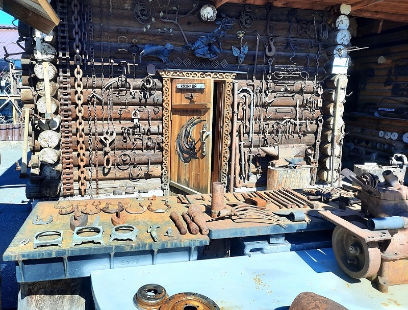 Деревенская кузница находится под открытым небом. Здесь показаны изделия, сделанные ручной обработкой металла. На стене представлены изделия, выкованные кузнецами на наковальне, это подковы, лопаты, гвозди, кольца, цепи, молотки, серпы.