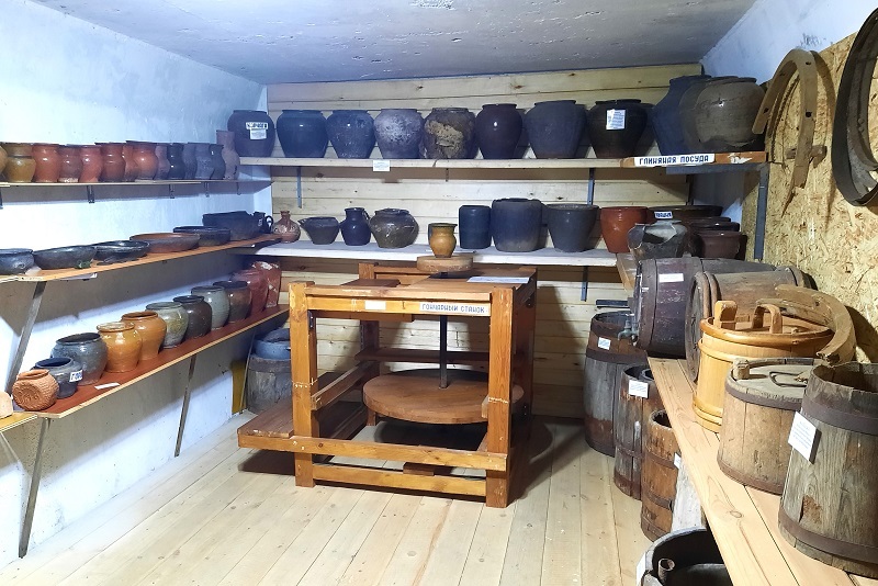 Гончарная мастерская. В помещении гончарной мастерской установлен гончарный станок и изделия из глины. С правой стороны расположены кадушки для хранения воды и продуктов. Часть помещений музея не отапливается.