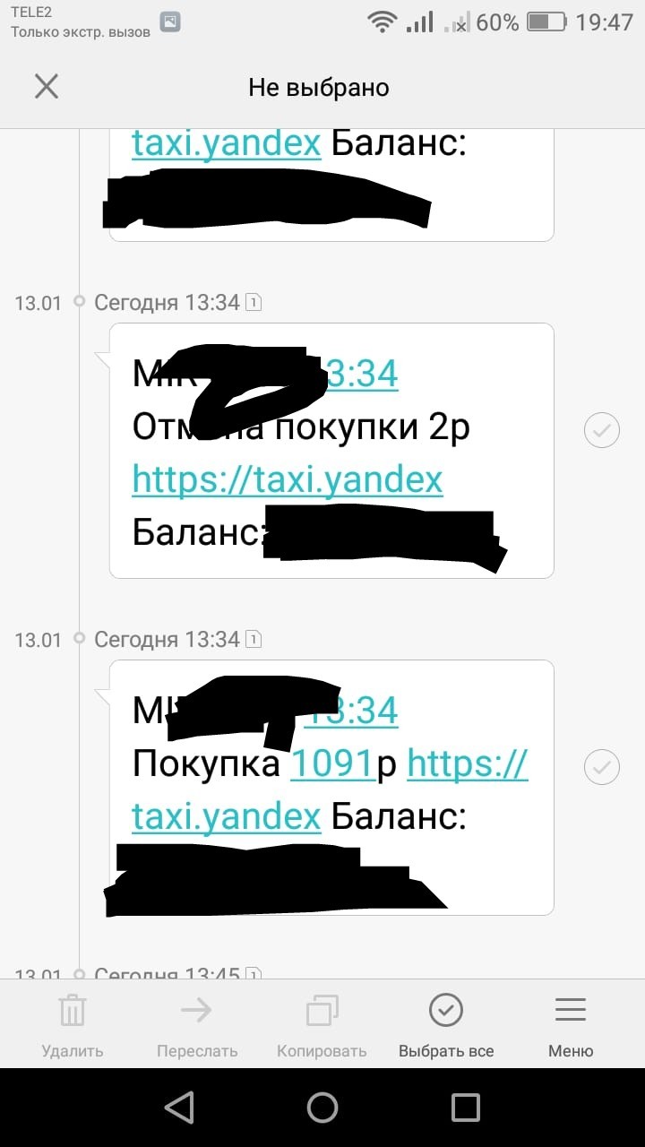 Приходят, значит, мне сегодня смски от банка о том, что сначала сняли с меня в Яндекс. Такси 2 рубля, потом вернули. И затем оплата поездки на 1091 рубль...