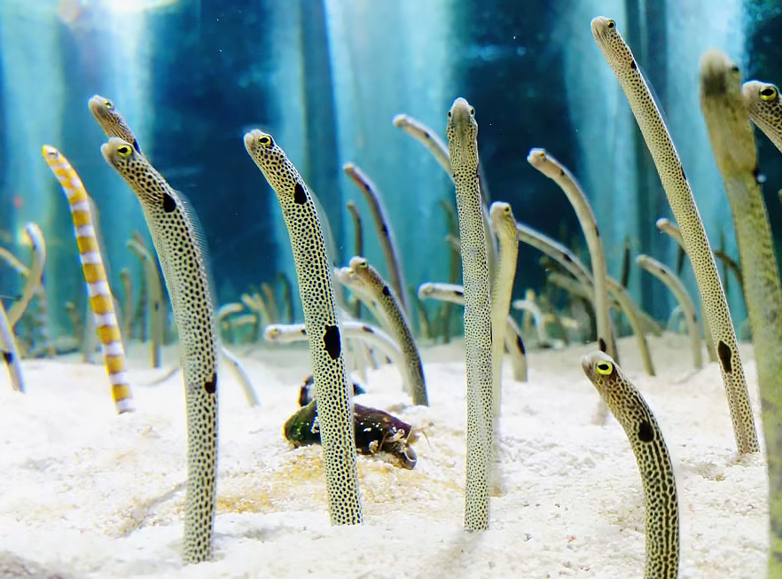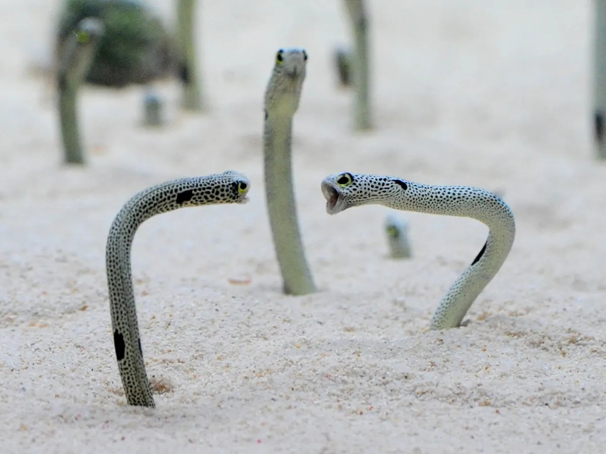 Цирк этот расположен на 15-метровой глубине в Красном море, в заливе Акаба, и из рыхлого песчаного дна поднимаются вовсе не змеи, а рыбы – пятнистые садовые угри и красноморские горгасии. Всю свою жизнь эти угри проводят, ввинтившись в песчаные норки своими хвостами и выставив наружу две трети туловища – ни дать ни взять сад морских водорослей.