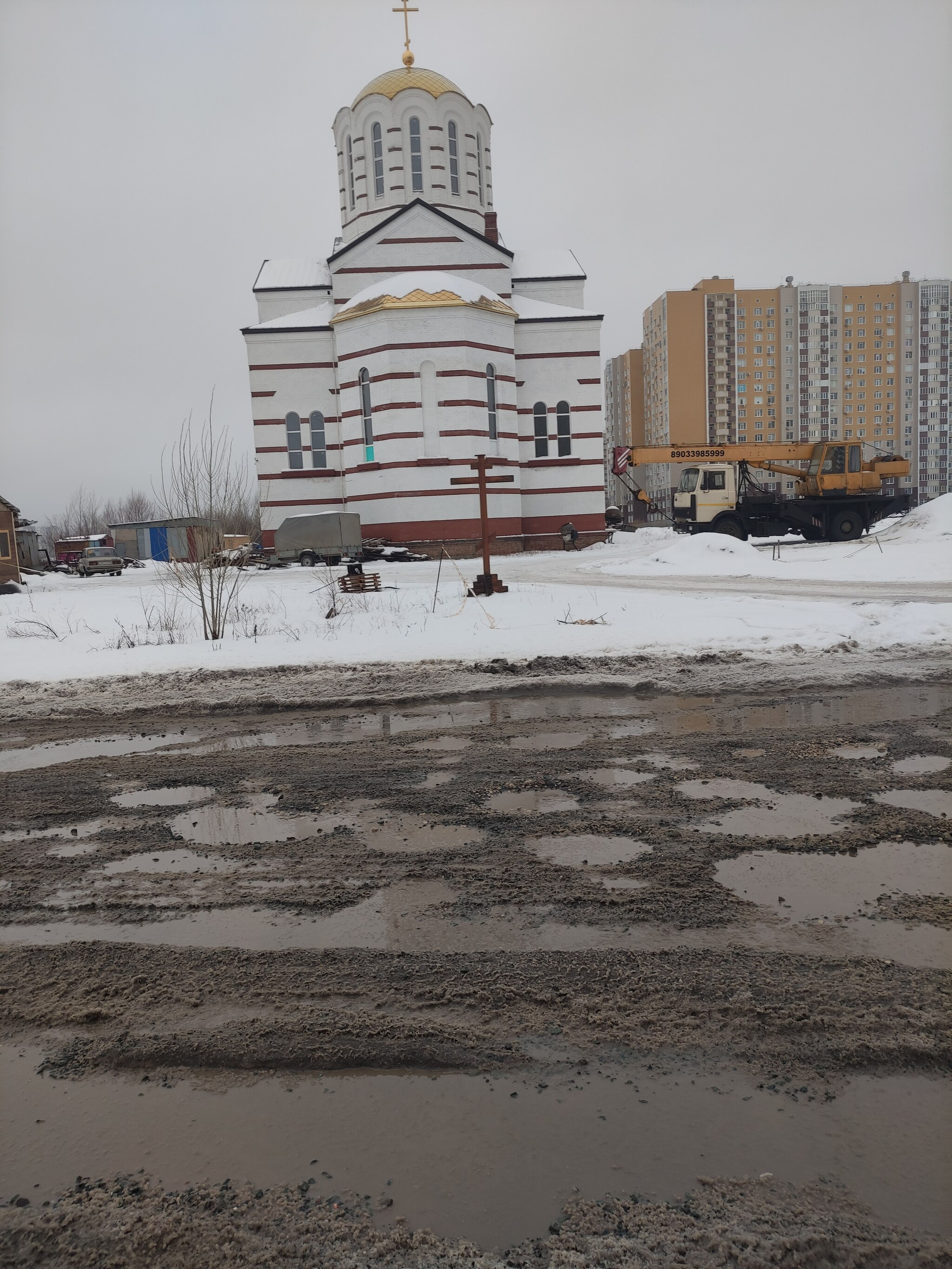 И что то мне подсказывает, что денег за которые построили эту церковь с лихвой хватило бы на асфальтирование этой дороги. А на оставшиеся можно было бы осветить наш посёлок. Осветить в том плане, что у нас в посёлке нет уличного освещения, и ночью царит непроглядная тьма.