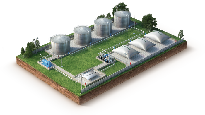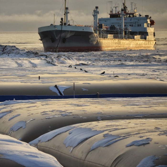 Это Российское хранилище нефти в районе полуострова Ямал. Добытую нефть сначала хранят в этих "Передвижных Эластичных Резервуарах Нефть-Газ" (ПЭР-НГ). Это своего рода сепараторы, они позволяют отстоять нефть до транспортировки в танкер, отделяют нефтяной газ, который тут же используется в котельной.