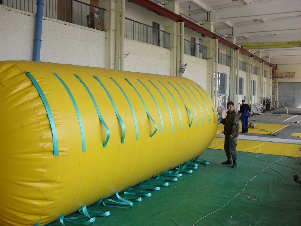Это Inflatable Dam. В России этот продукт называется Водоналивная Рукавная Дамба, или ВРД. Поставляется несколькими компаниями. Имена легко гуглятся. Основной потребитель МЧС, военные, нефтянники и строители.