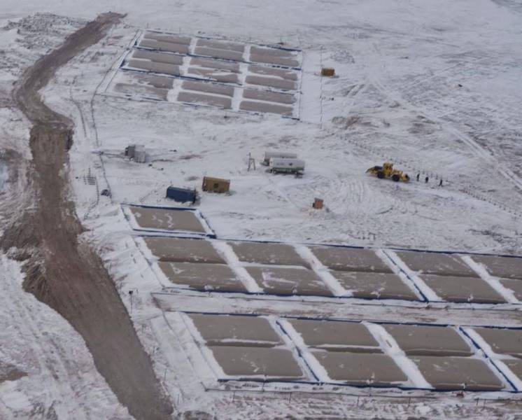 Это Российское хранилище нефти в районе полуострова Ямал. Добытую нефть сначала хранят в этих "Передвижных Эластичных Резервуарах Нефть-Газ" (ПЭР-НГ). Это своего рода сепараторы, они позволяют отстоять нефть до транспортировки в танкер, отделяют нефтяной газ, который тут же используется в котельной.