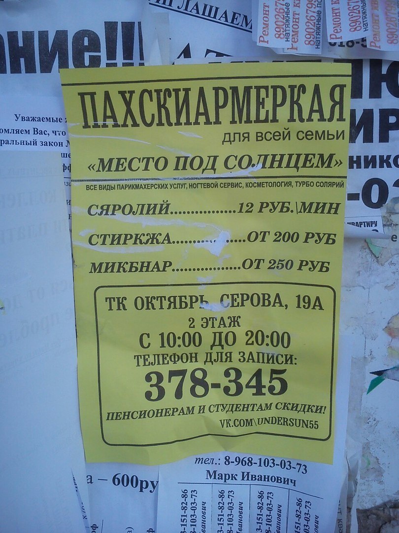 30 OnionCrocoDie333 Чуть мозг не сломал пытаясь это прочитать 8 лет назад Либо это гениальная идея рекламы. [моё] Омск Парикмахерская Объявление