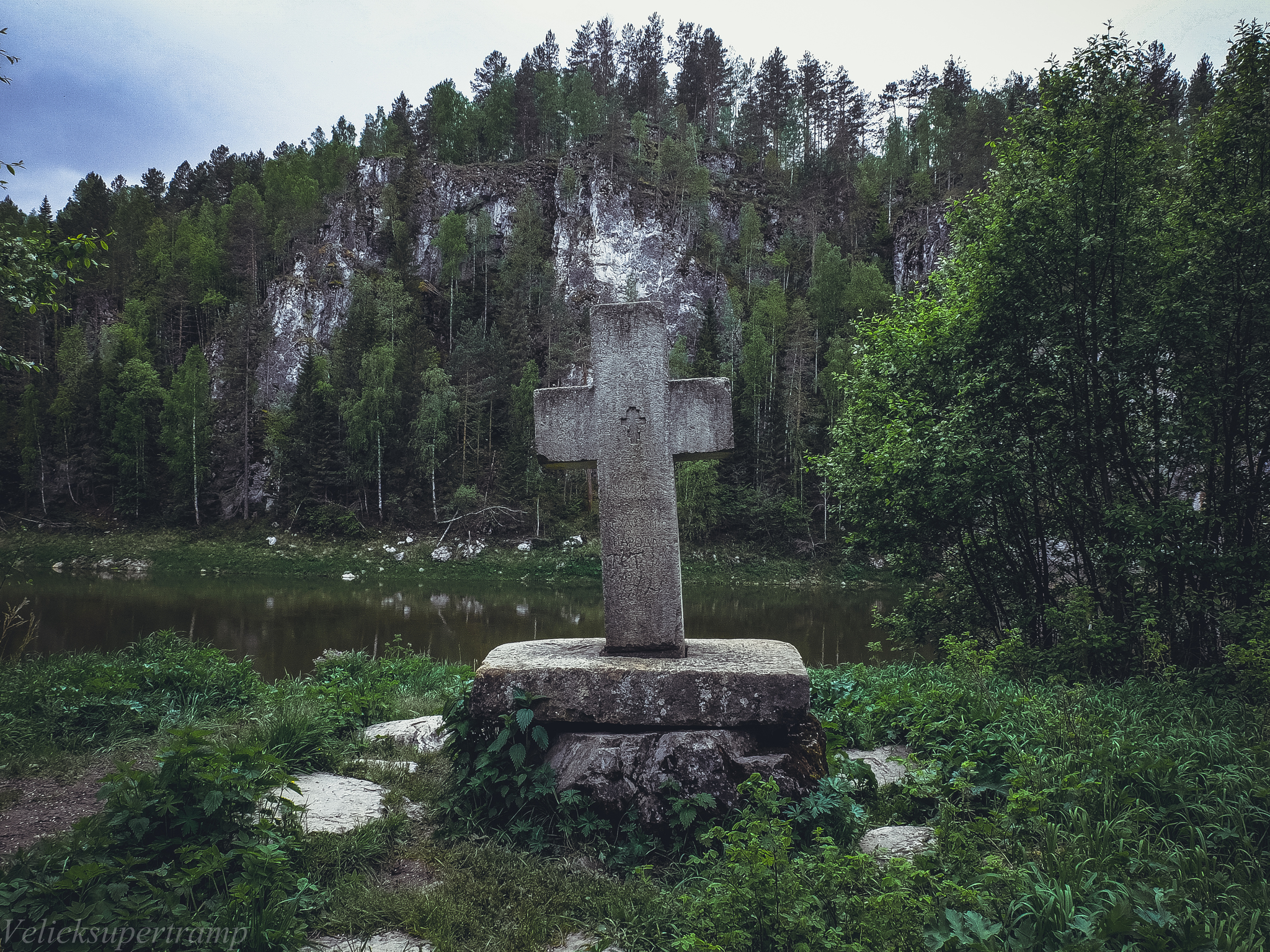 Демидовский крест. За ним виднеется камень "Писаный". Крест установлен в 1779 году на месте рождения Никиты Демидова - младшего сына Акинфия Никитича Демидова.