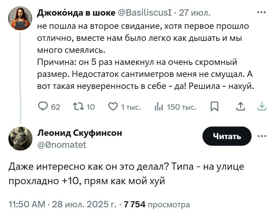 10123 Perevalka Неуклонно стервенею Всё обо всём Юмор Чувак задоджил пулю Серия Приколы для деградировавших и деградирующих 6 месяцев назад Скриншот X (Twitter) Юмор Мат Свидание Комментарии 923 40 6 3 2 Ещё 0