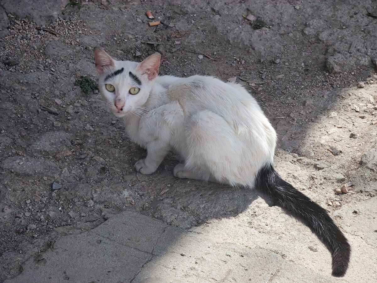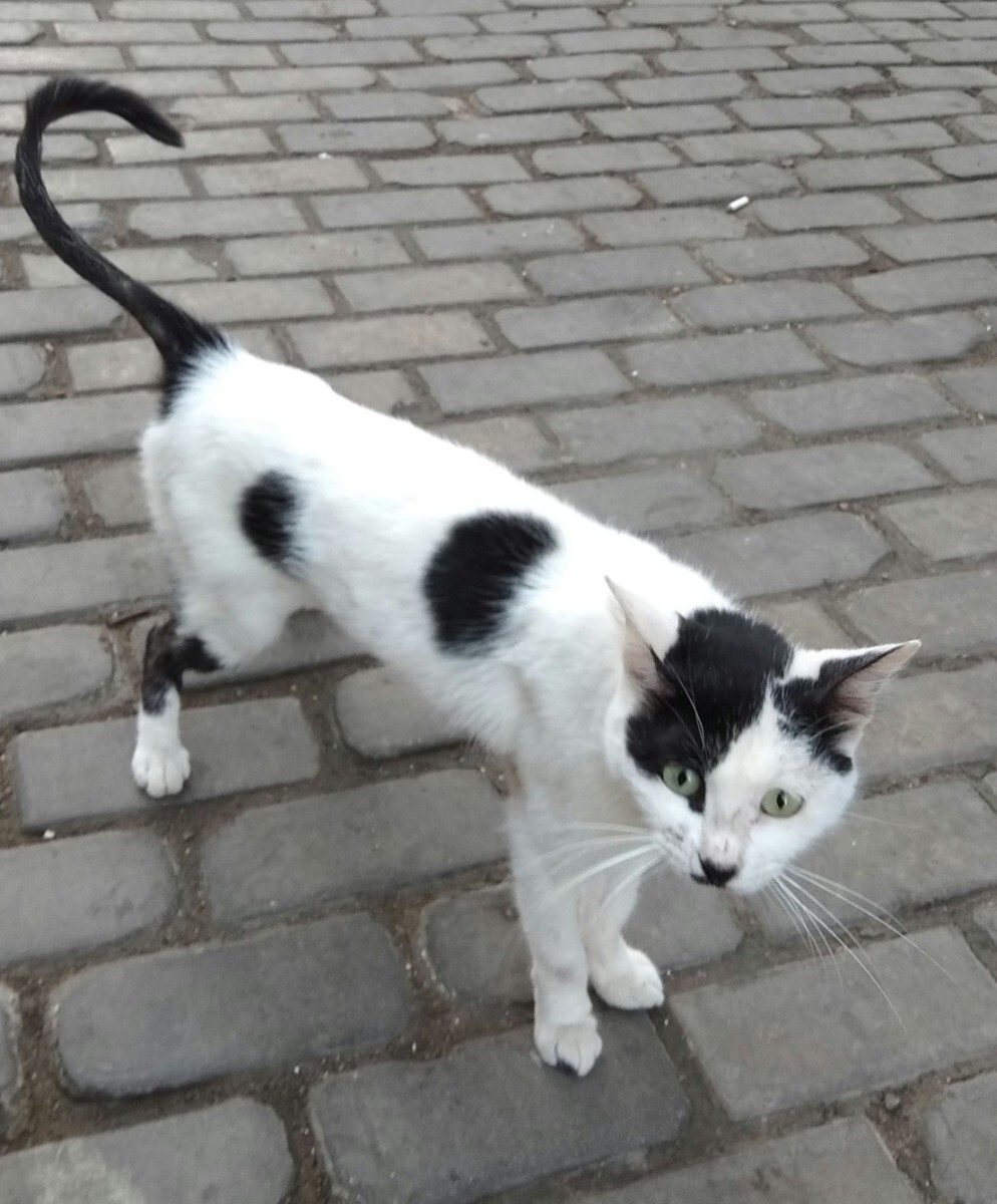 Животное было смешное, фотка запомнилась, поэтому когда мы вернулись в тот же город - снова стали искать котеек с необычным окрасом. И удивительное: там необычно много белых кошек, у которых полностью чёрный хвост. Посмотрел старые фотки - нашёл ещё одного, с хвостом, чёлкой и усами: