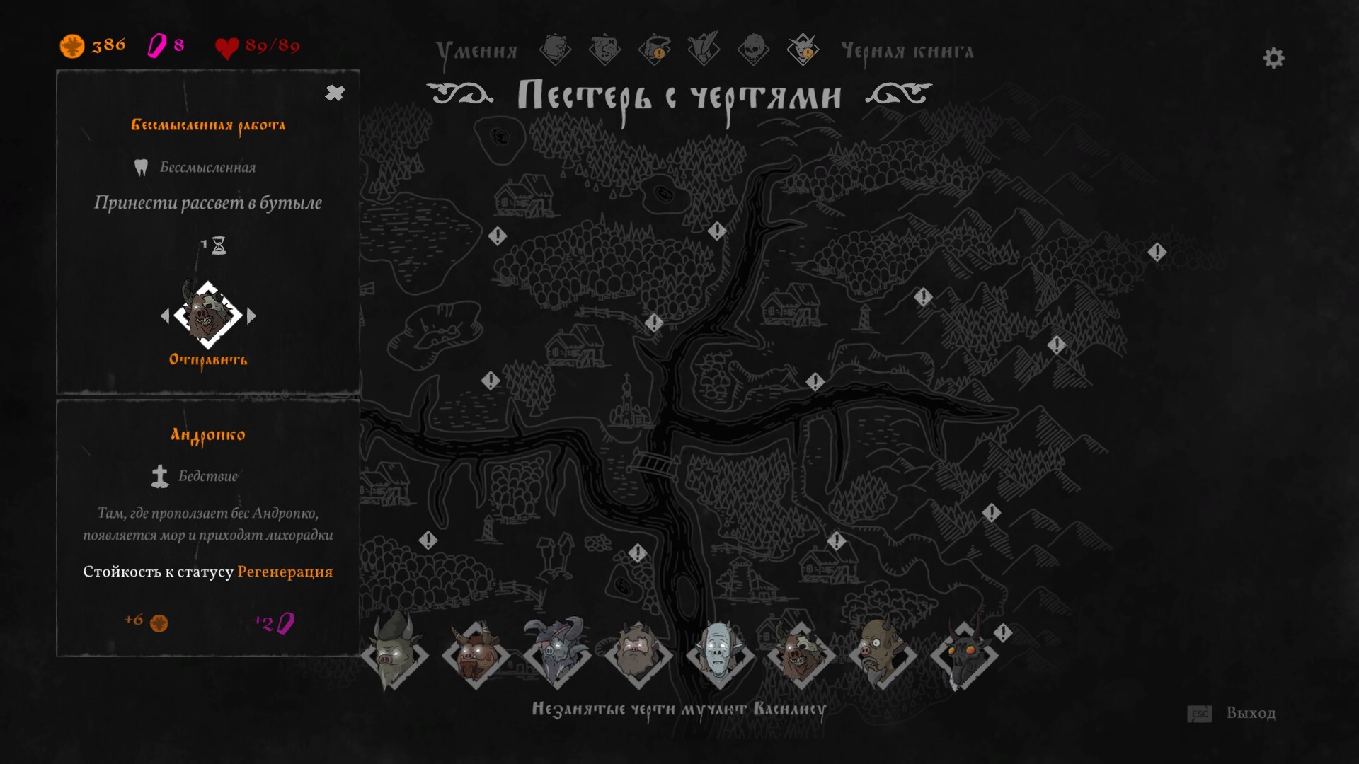 В игровом процессе это отражено через систему негативных эффектов. Когда Василиса отправляет беса портить крестьянское хозяйство, она получает определённое количество греховных очков. При успешном выполнении задания нерадивый помощник ещё и добудет для хозяйки монету-другую. Пренебрежение же своими обязанностями повлечёт за собой штрафные дебаффы при следующих вылазках векши.