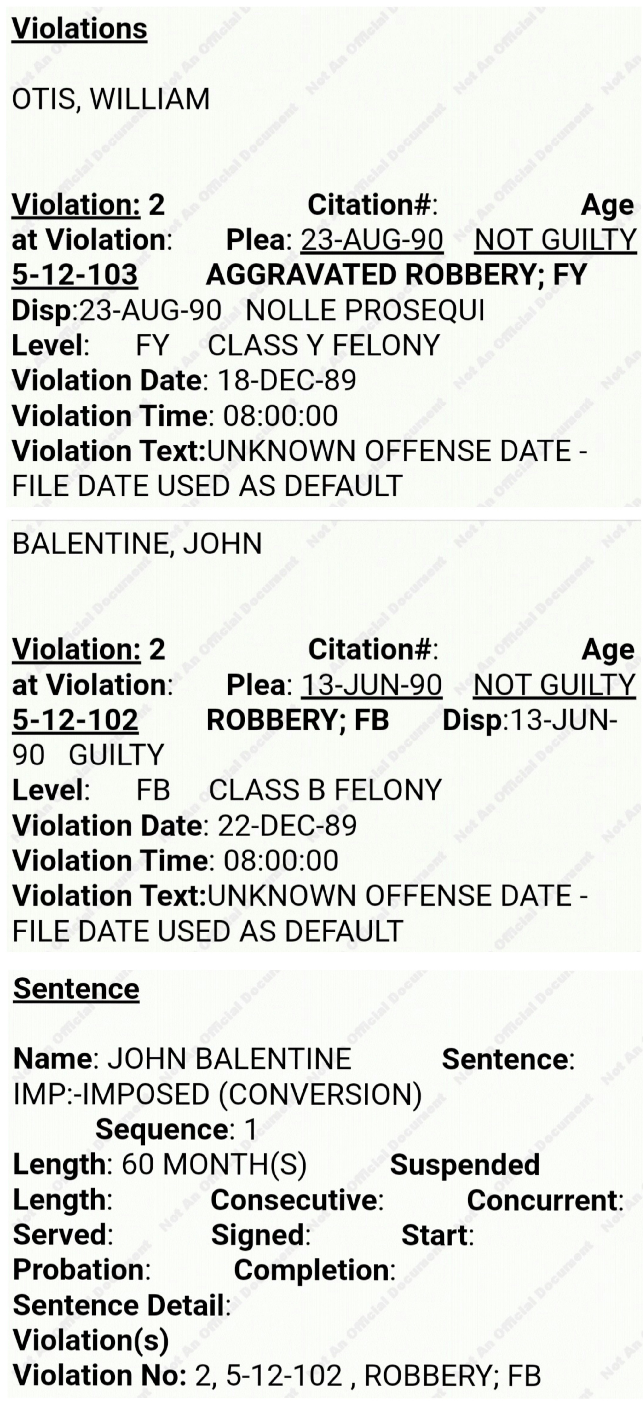 (Интересно что тюремное бюро в своём досье упоминает что Балентин был осуждён штатом Арканзас где-то до марта (в этот месяц он был выпущен из тюрьмы) 1982 года за кражу со взломом - это преступление и осуждение никогда не упоминается в каких-либо судебных и апелляционных документах. Помимо этого, странно что бюро описывает "Arkansas Cardinal Abuse Kidnapping and Aggravated Assault with a Knife" как произошедшее до 1989 года - описание преступления похоже на похищение Розы Миллер, но оно было в 1996, а не до 1989. Это либо ошибка, либо Балентин действительно совершил подобное преступление до 1989, но в таком случае о нём никогда не упоминалось в каких-либо документах. Ну и да, бюро почему-то не упоминает кражу винтовок в 1983, за которое Балентин был осуждён в 1985).