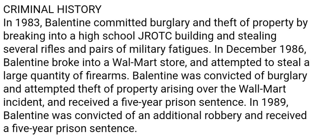 В неназванную дату 1983 года, когда Балентину было либо 13 лет, либо 14, он в штате Арканзас (где родился и вырос) пробрался в военизированное здание "Учебный корпус младших офицеров запаса" (они же "JROTC") и украл оттуда несколько винтовок и военную форму. За это его в 1985 году приговорили к неназванному сроку (без уточнения, был ли этот срок на заключение в тюрьме или на условное заключение):