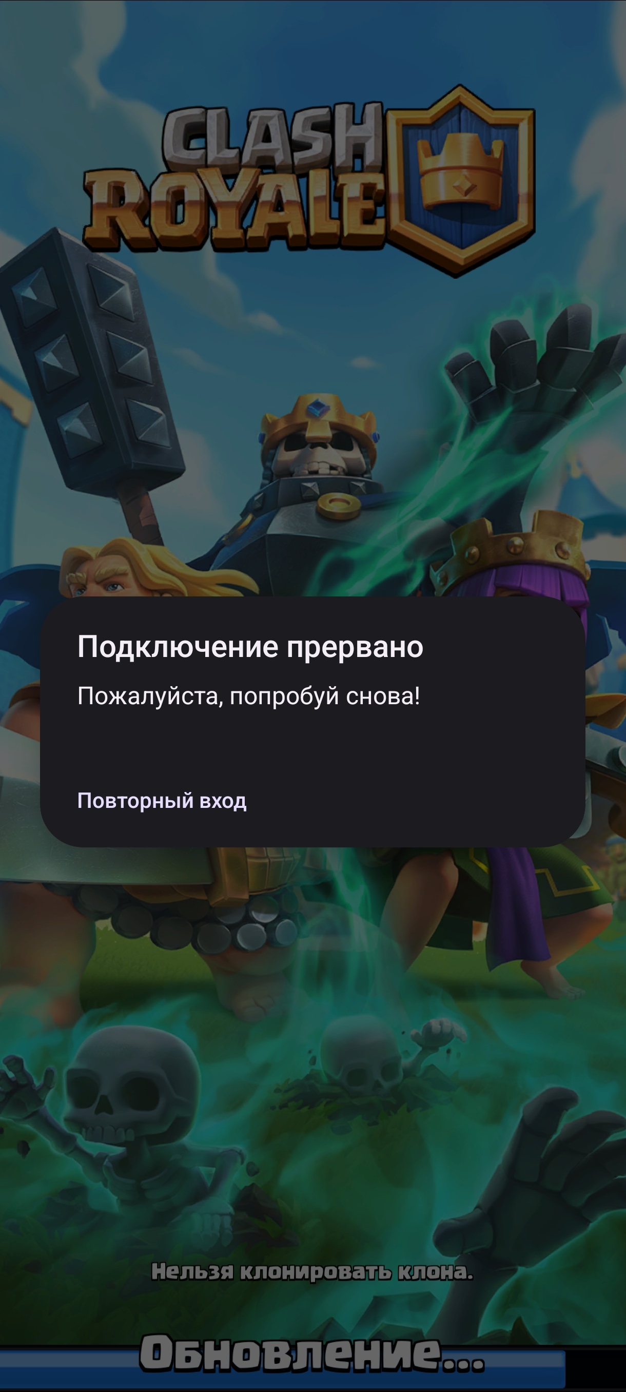 4 DmitryArxangel Clash Royale & Clash of Clans Clash Royale 2 месяца назад всем привет. кто может помочь? Захожу в Клеш Рояль, у меня просто бесконечное обновление, а потом просит повторить попытку. пробовал переустанавливать и у гугл плея обновления сбрасывал. ВПН и ДНС не помогают. Игры Clash royale Телефон Длиннопост Ещё 0