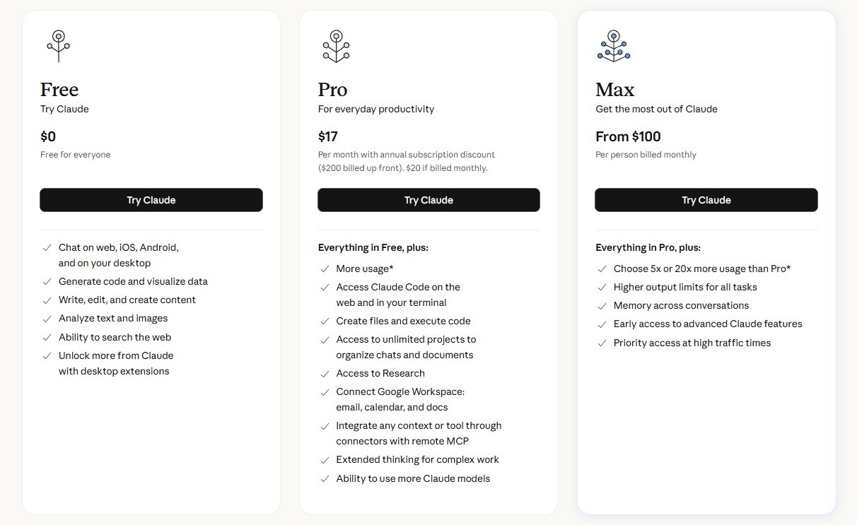 Тарифная линейка Claude создана так, чтобы каждый пользователь мог подобрать удобный уровень возможностей — от базовых задач до интенсивной профессиональной работы. Это важно учитывать, если вы планируете Claude купить подписку или хотите понять, какой объём лимитов нужен для ваших рабочих процессов.