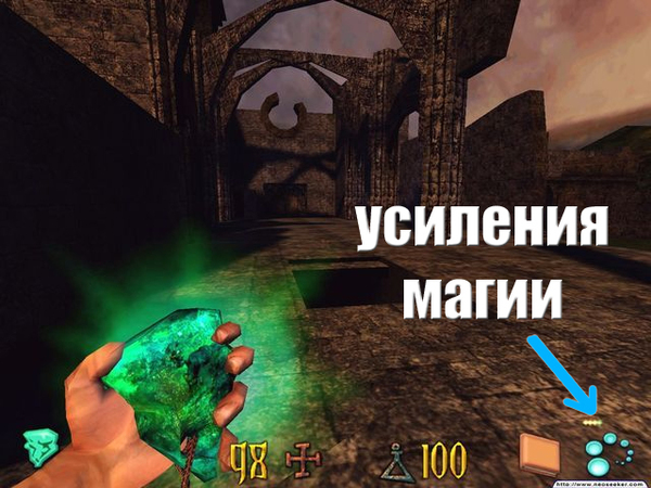 Так же этой рукой используется тот самый зеленый камушек Гельзиабара. Использовать его как оружие не особо интересно, ибо он просто отталкивает врагов. Есть информация, что если использовать его слишком часто, то вдруг откуда не возьмись появится демон и насует ГГ по первое число, но мною эта инфа не проверена. Использовать этот камень нужно по сюжету, или для усиления магии, что бывает весьма полезно.