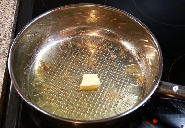 Вынимаем курицу из сковороды и в это же масло кидаем кусочек сливочного