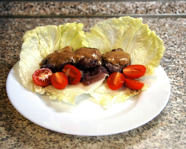 Подаем курицу на листьях салата. На них укладываем винный лук, далее курицу, украшаем томатами чери. Готовим заправку соус для курицы - берем 2-3 столовых ложки винного маринада, в котором тушилась курица и добавляем 1 чайную ложку дижонской горчицы. Поливаем соусом курицу!