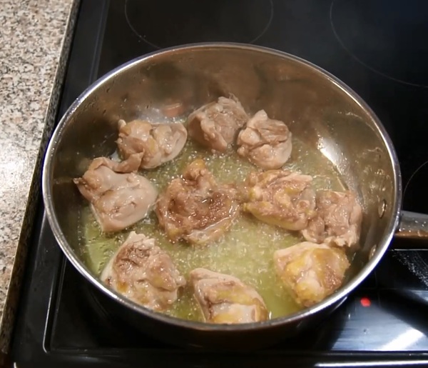 Раскладываем курицу на сковороду. Не солим и не перчим! Обжариваем по 2-3 минуты с каждой стороны.