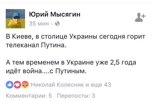 56 Drugoon 9 лет назад Cсвобода слова аж горит. Сегодня подожгли редакцию "Интер" - телевизионного канала в (на) Украине. А это тот один из тех самых, что призывал на "майдан" Короче жопа в головах, не знают как реагировать. Украина СМИ и пресса Пожар Идиотизм Вот так вот