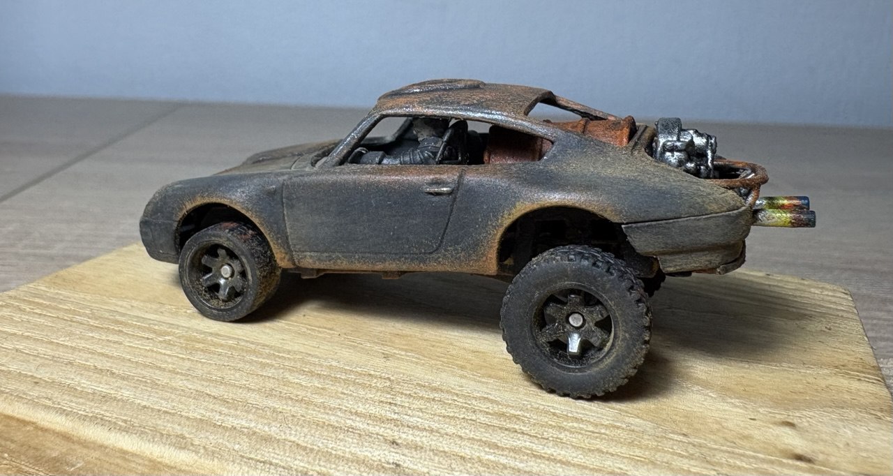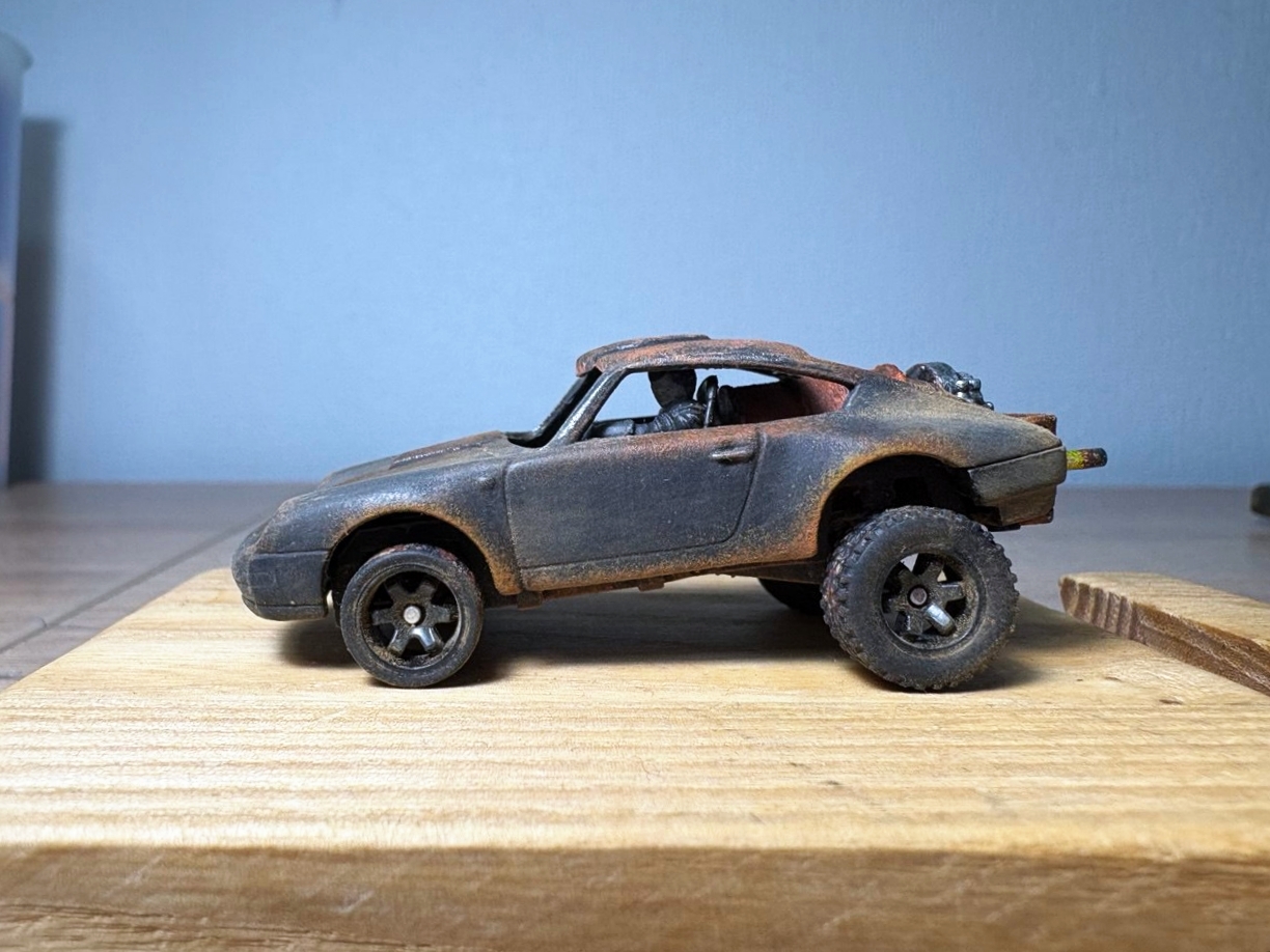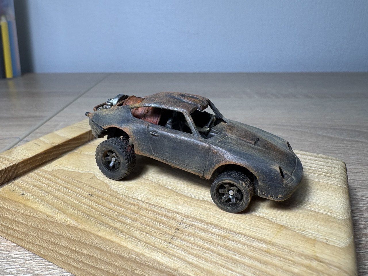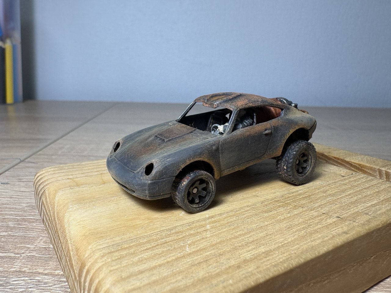 Моя первая модель. От оригинала только кузовщина. Рама, водитель, двигатель, бочка напечатана на 3D-принтере. Использовал также пластиковую карту и ПВХ 3мм. Колеса - заказ с Али. Окраска акрилом кистью и губкой. Давно мечтал сделать кастом модель 1/64 в постапокалиптическом стиле.