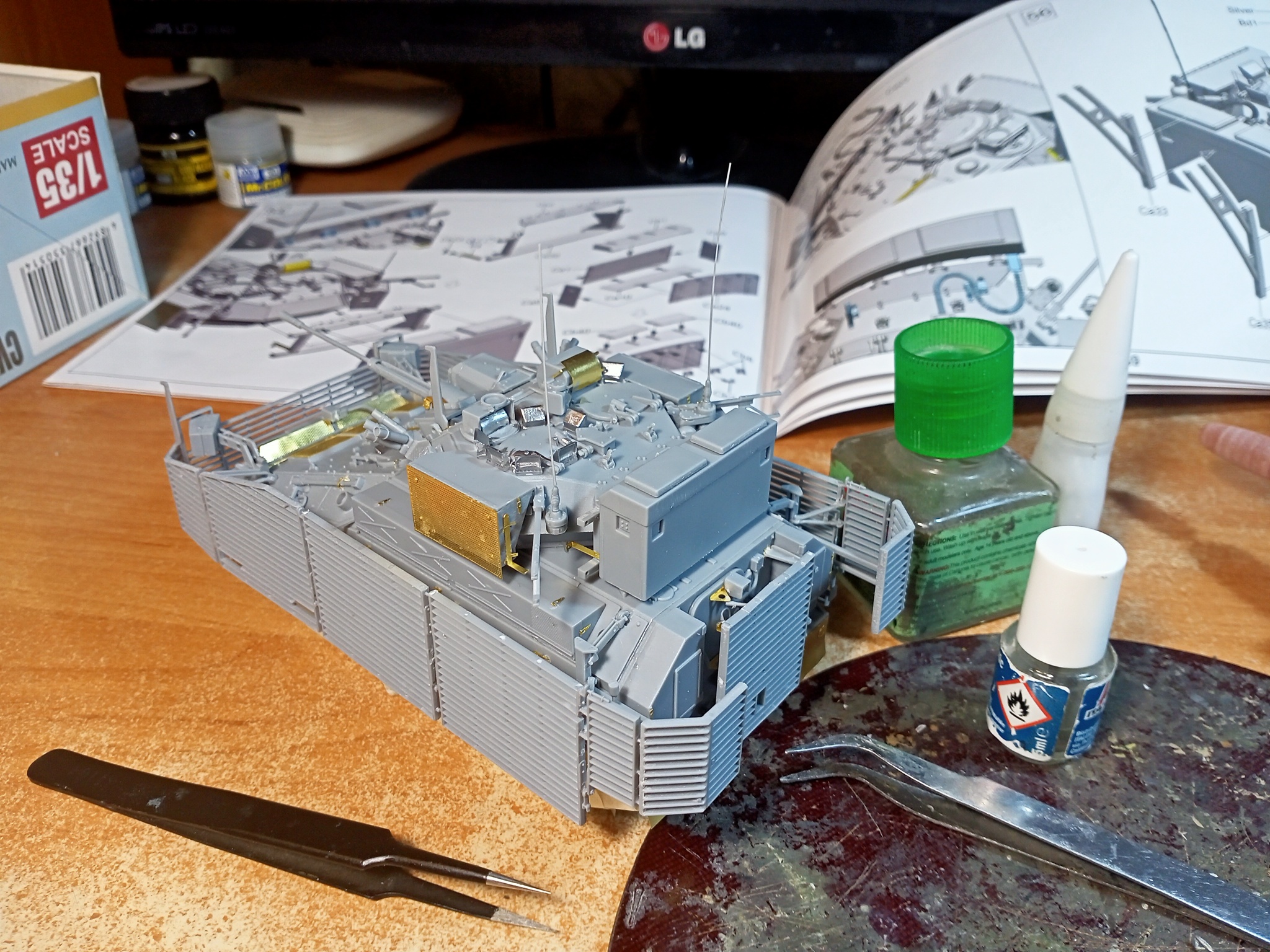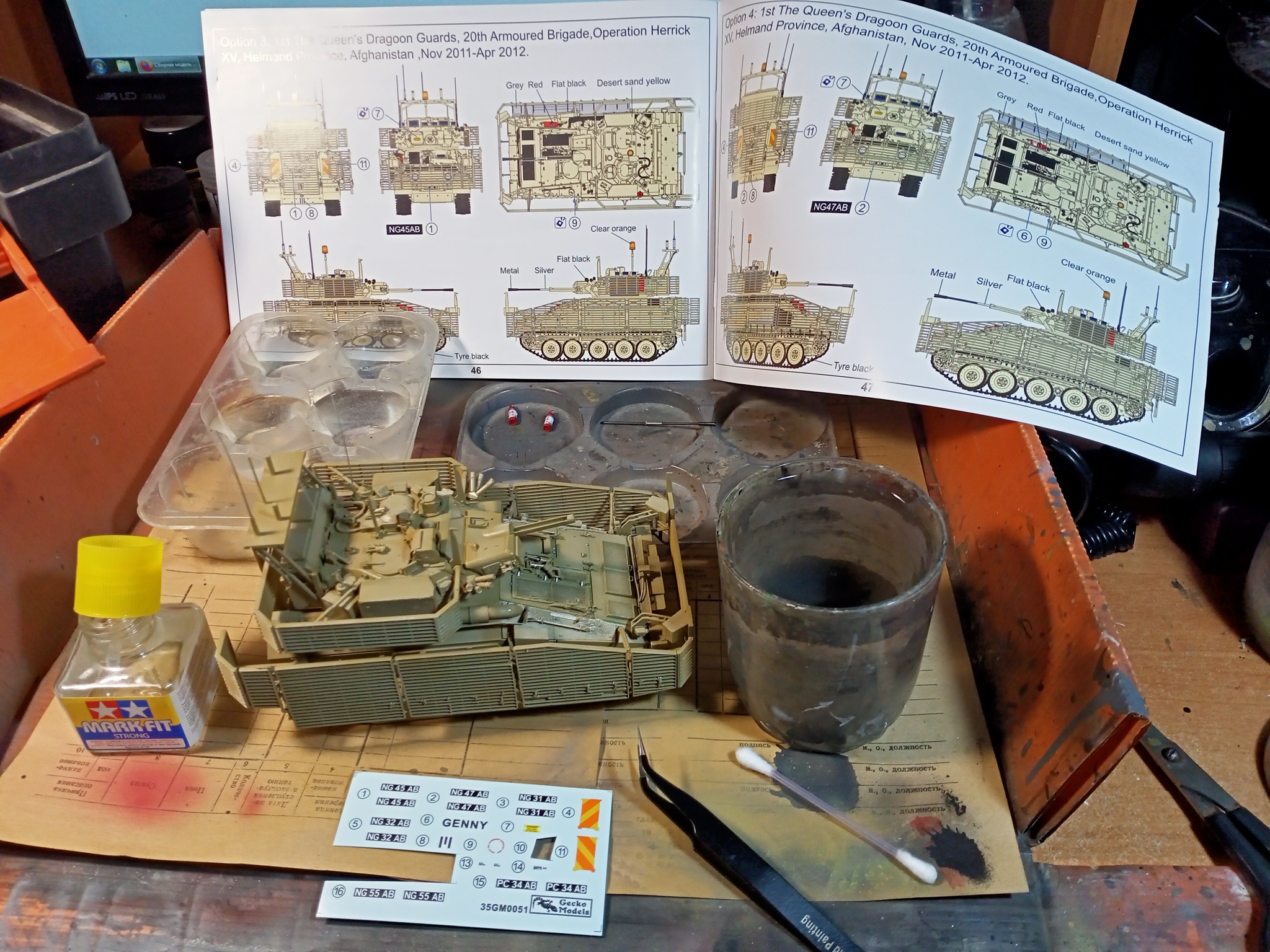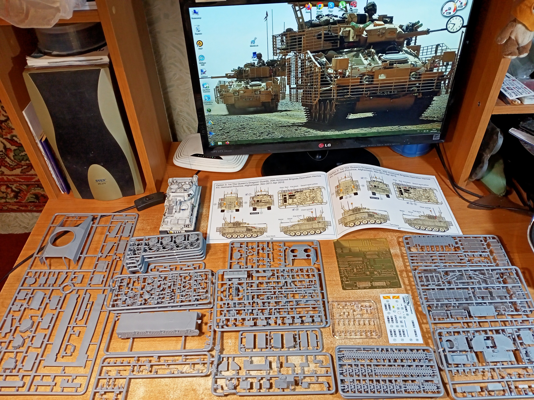 О наборе: очень свежий набор 2021 года от молодой (работают с 2017) китайской фирмы Gecko Models в масштабе 1/35. В крупной двойной (как у дорогих наборов "Звезды") коробке лежат целых 20 литников из полистирола серого цвета (правда, некоторые из них очень маленькие), один литник из прозрачного пластика, внушительная платка фототравления, декаль и инструкция-журнал. Количество деталей: полистироловых - 487, из них у меня остались 50 неиспользованными, прозрачных - 25 и три идут в запас, травлёных - 146, остались 10. Как видим, для небольшой модели набор действительно сложный, деталей по-настоящему много. Качество литья превосходное, были обнаружены только небольшие следы стыковки половин пресс-форм и крошечный облой на паре деталей. Следов от толкателей и питателей нет нигде, даже на траках, мелкие детали невероятно ажурны, напоминают высококлассное литьё под низким давлением (а-ля ModelSvit) или смолу. Пластик вполне привычный, не ломкий, в работе приятен. Детализация - 99 из 10!!! Наверное, самый детализированный набор, что мне приходилось собирать! Устройство для закрепления пушки по-походному - 7 деталей, из них 3 травлёных. Ящики ЗИП на башне - по 16 деталей на каждый, 13 травлёных. Дополнительные листы керамической брони выполнены отдельными деталями, которые клеятся поверх корпуса, как на оригинале. В фарах сделаны имитации лампочек. Само собой, есть миллион заклёпочек, болтов, мелких рукояточек, барашков, проводков и т.д... Прозрачные детали очень чистые, ими даны все приборы наблюдения и прицелы, а также фары и мигалка. Габаритные огоньки отлиты из обычного пластика. Модель имеет элементы интерьера в башне: казённик пушки и внутренние части прицелов-перископов, также прекрасно проработаны внутренние поверхности всех трёх люков членов экипажа, что позволяет их сделать открытыми. Однако поскольку в открытые люки будет виден голый пластик (в основном), их лучше занять фигурками танкистов, но я этого не стал делать. Стыкуемость великолепная, все пластиковые и травлёные элементы идеально подходят друг другу, но собирать модель всё равно очень тяжело из-за сложности, большого количества мелочей и особенностей конструкции бортовых экранов (крепятся в паре точек на весу, затем закрывают доступ к бортам...). В наборе много фототравления, работать с ним хлопотно и интересно, оно очень повышает "копийность" модели. Гусеница - частично наборная, очень ажурная и аккуратная, прекрасно собирается сама и садится на катки; единственный грешок - не дали ни одного запасного трака, хотя сломать/потерять их очень легко. При этом даны два "запасных" опорных катка и целая куча дымовых мортирок. Набор имеет очень ограниченную вариативность по сборке, выбираем из двух типов дымовых гранат, можем открыть/закрыть люки экипажа, заднюю дверь и защищающий её экран, а также прицел наводчика. Бонусов в наборе нет. Инструкция - целый глянцевый журнал, цветная книжка на 47 страниц! Тут есть краткая, но содержательная статья о прототипе, сборочная инструкция цветная, сложные этапы показаны с разных проекций и детали выделены разными цветами, есть даже советы моделисту! Схемы окраски и маркировки цветные, показывают машину в пяти проекциях (кроме вида снизу). Предлагается 4 варианта, все воевавшие в Афганистане в ходе операции Herric в 2011-2012 годах, все одноцветные песочные, имеют идентичную маркировк