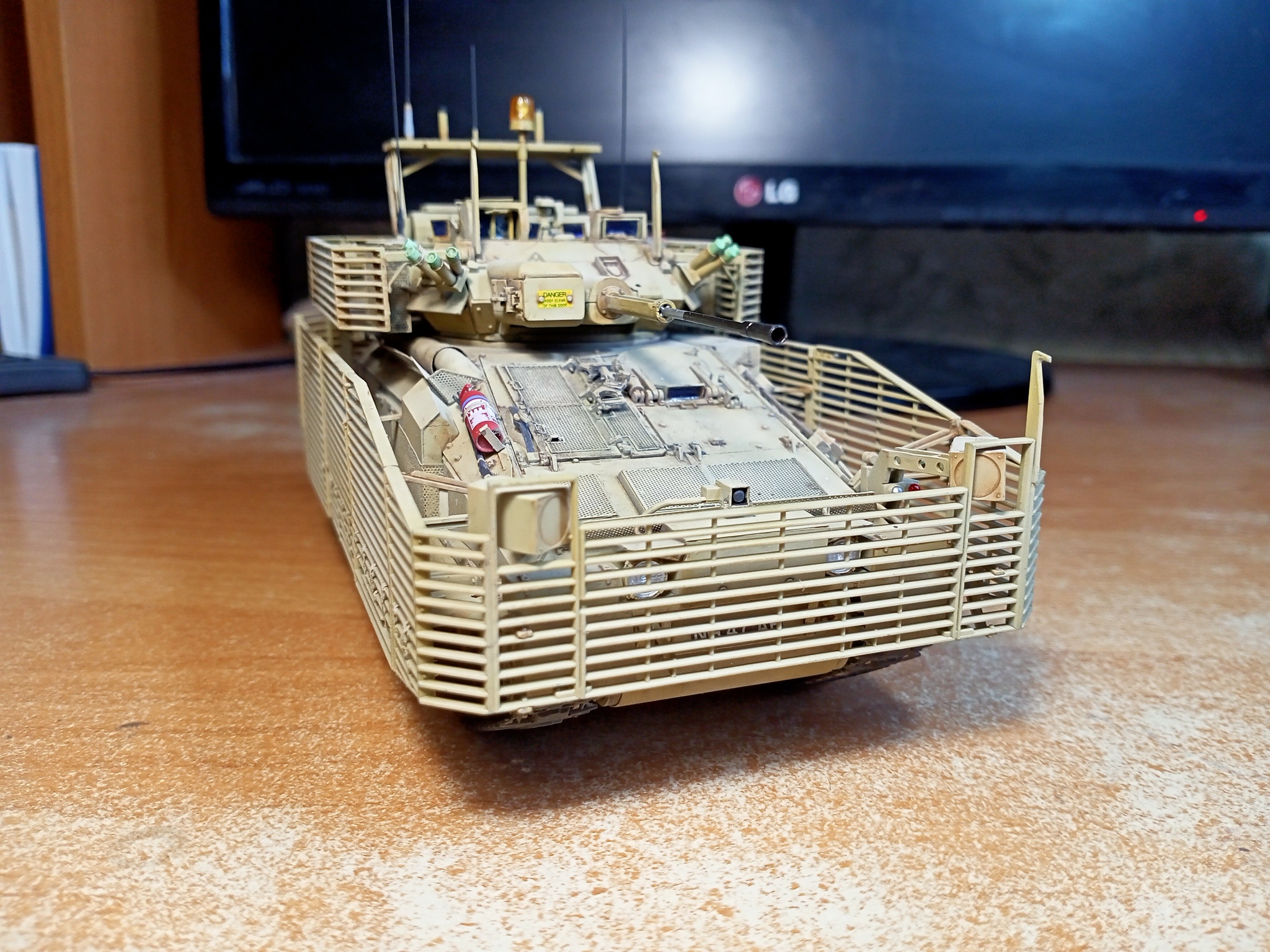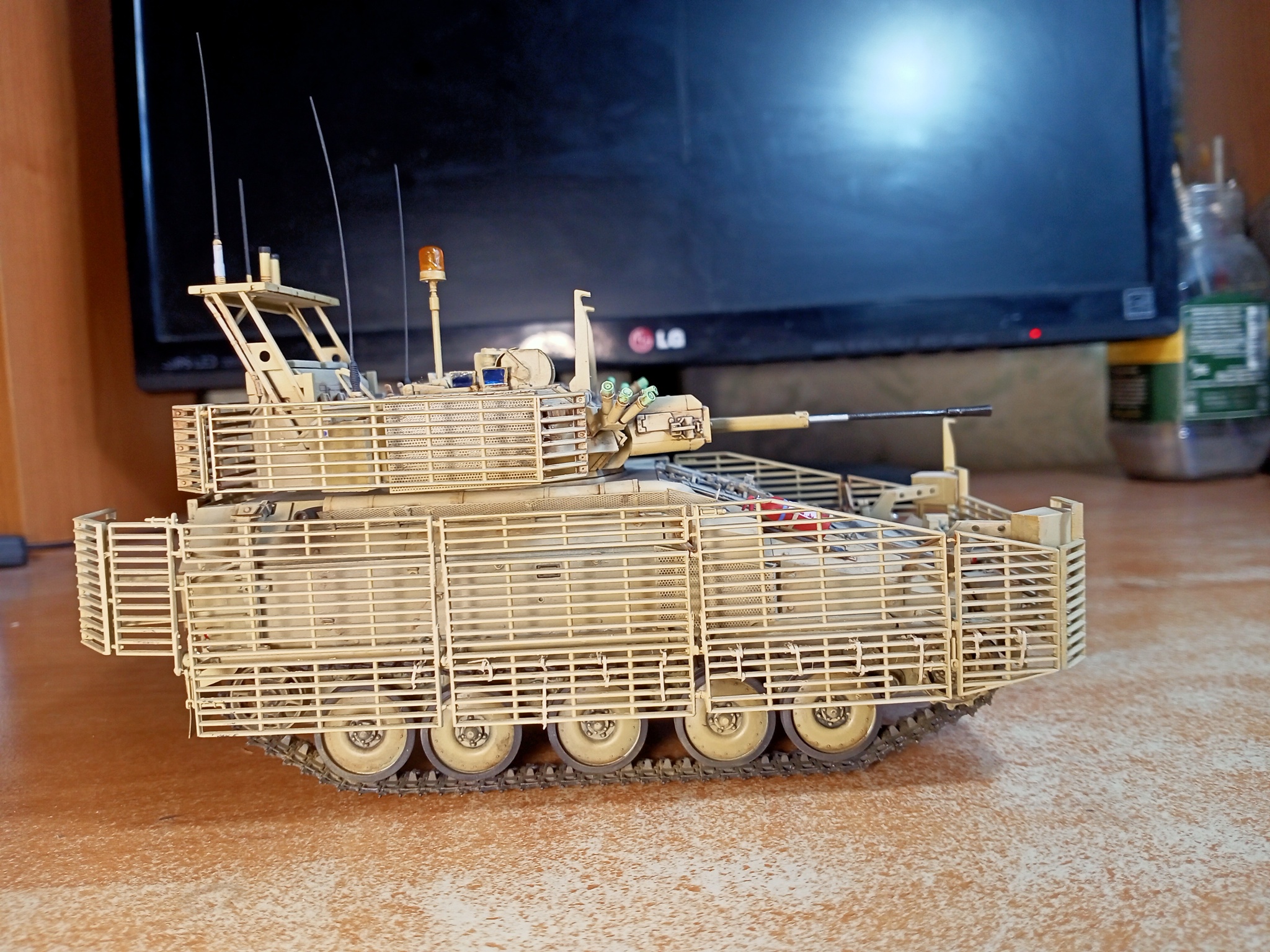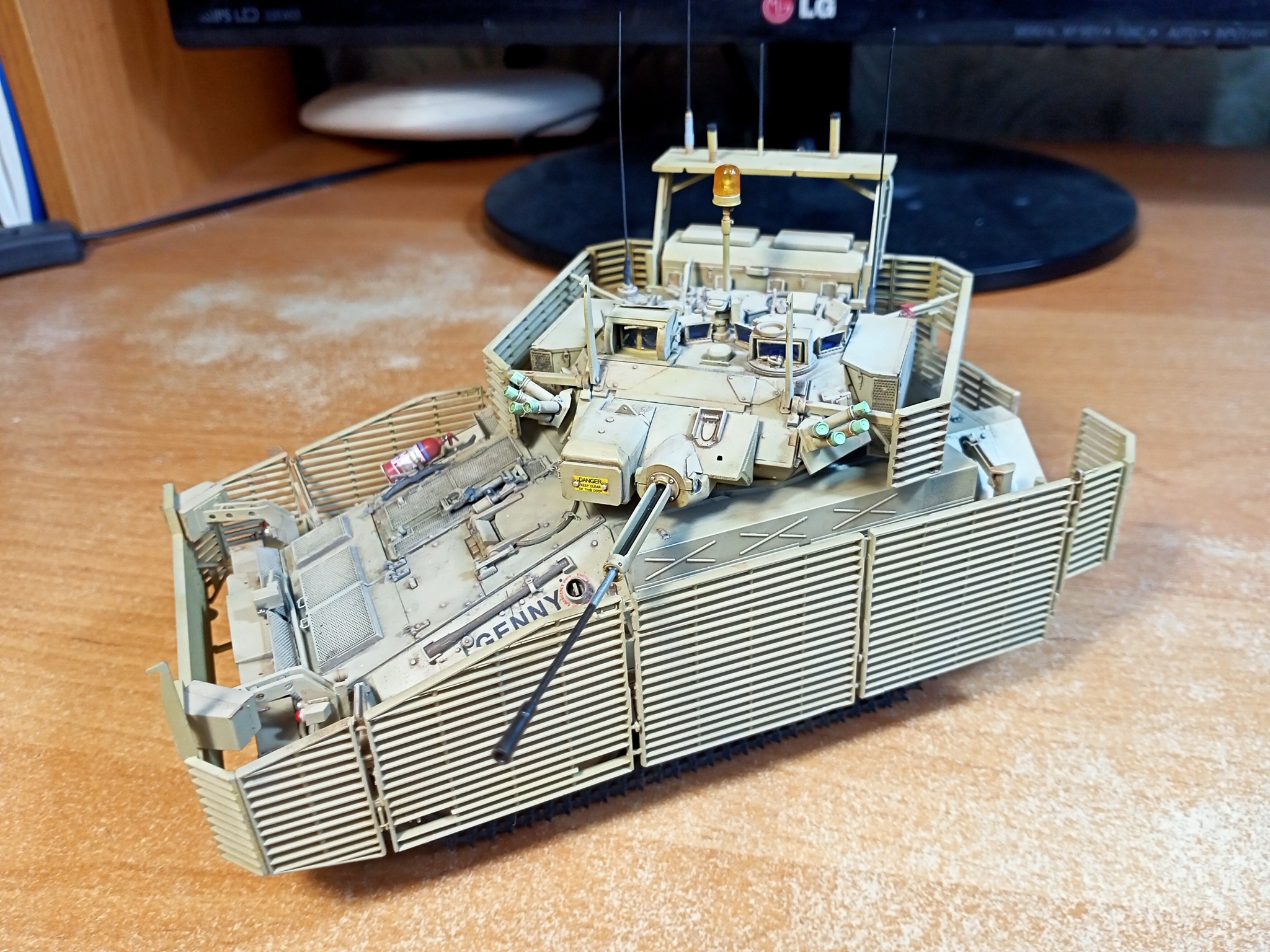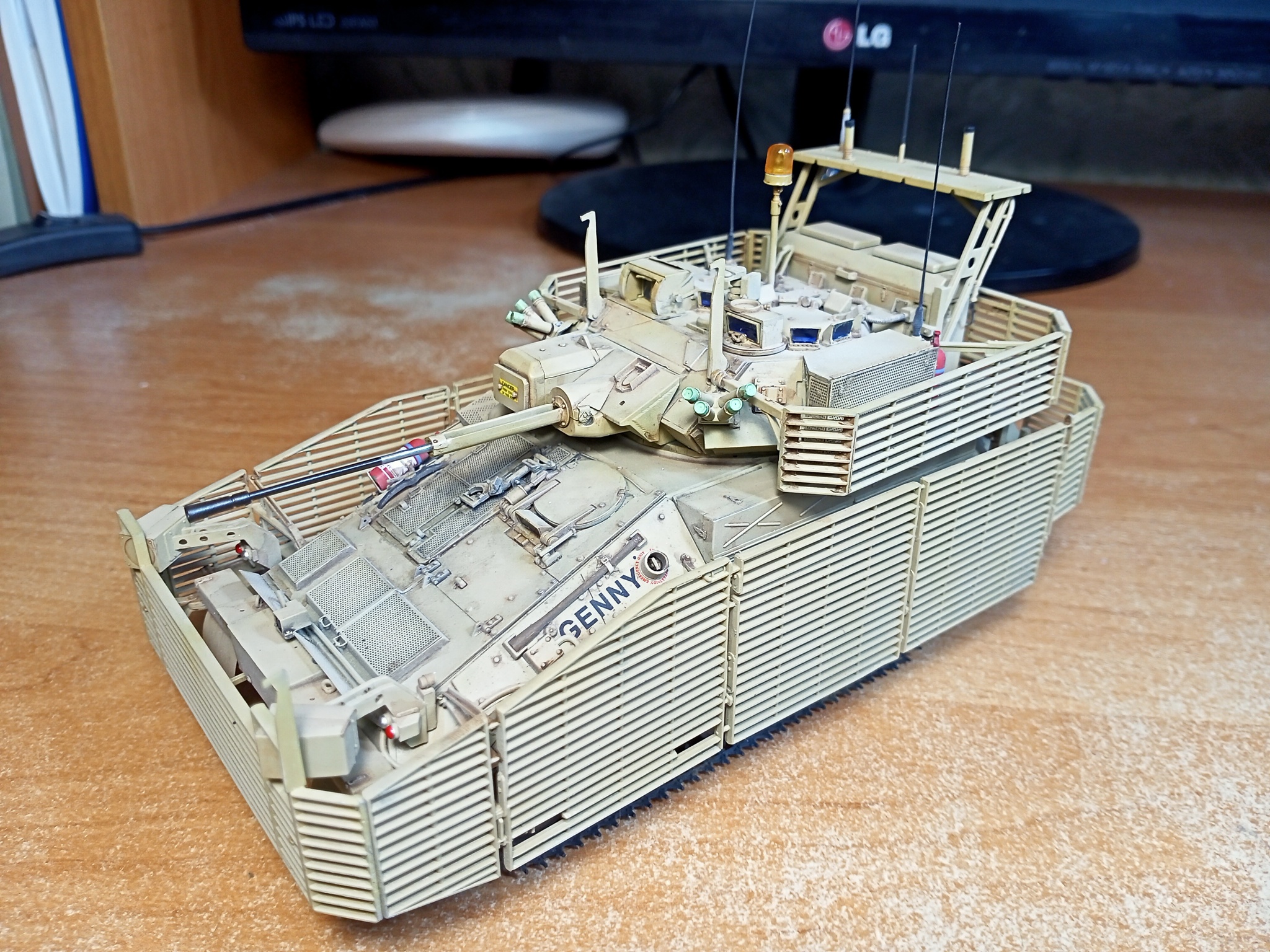 О наборе: очень свежий набор 2021 года от молодой (работают с 2017) китайской фирмы Gecko Models в масштабе 1/35. В крупной двойной (как у дорогих наборов "Звезды") коробке лежат целых 20 литников из полистирола серого цвета (правда, некоторые из них очень маленькие), один литник из прозрачного пластика, внушительная платка фототравления, декаль и инструкция-журнал. Количество деталей: полистироловых - 487, из них у меня остались 50 неиспользованными, прозрачных - 25 и три идут в запас, травлёных - 146, остались 10. Как видим, для небольшой модели набор действительно сложный, деталей по-настоящему много. Качество литья превосходное, были обнаружены только небольшие следы стыковки половин пресс-форм и крошечный облой на паре деталей. Следов от толкателей и питателей нет нигде, даже на траках, мелкие детали невероятно ажурны, напоминают высококлассное литьё под низким давлением (а-ля ModelSvit) или смолу. Пластик вполне привычный, не ломкий, в работе приятен. Детализация - 99 из 10!!! Наверное, самый детализированный набор, что мне приходилось собирать! Устройство для закрепления пушки по-походному - 7 деталей, из них 3 травлёных. Ящики ЗИП на башне - по 16 деталей на каждый, 13 травлёных. Дополнительные листы керамической брони выполнены отдельными деталями, которые клеятся поверх корпуса, как на оригинале. В фарах сделаны имитации лампочек. Само собой, есть миллион заклёпочек, болтов, мелких рукояточек, барашков, проводков и т.д... Прозрачные детали очень чистые, ими даны все приборы наблюдения и прицелы, а также фары и мигалка. Габаритные огоньки отлиты из обычного пластика. Модель имеет элементы интерьера в башне: казённик пушки и внутренние части прицелов-перископов, также прекрасно проработаны внутренние поверхности всех трёх люков членов экипажа, что позволяет их сделать открытыми. Однако поскольку в открытые люки будет виден голый пластик (в основном), их лучше занять фигурками танкистов, но я этого не стал делать. Стыкуемость великолепная, все пластиковые и травлёные элементы идеально подходят друг другу, но собирать модель всё равно очень тяжело из-за сложности, большого количества мелочей и особенностей конструкции бортовых экранов (крепятся в паре точек на весу, затем закрывают доступ к бортам...). В наборе много фототравления, работать с ним хлопотно и интересно, оно очень повышает "копийность" модели. Гусеница - частично наборная, очень ажурная и аккуратная, прекрасно собирается сама и садится на катки; единственный грешок - не дали ни одного запасного трака, хотя сломать/потерять их очень легко. При этом даны два "запасных" опорных катка и целая куча дымовых мортирок. Набор имеет очень ограниченную вариативность по сборке, выбираем из двух типов дымовых гранат, можем открыть/закрыть люки экипажа, заднюю дверь и защищающий её экран, а также прицел наводчика. Бонусов в наборе нет. Инструкция - целый глянцевый журнал, цветная книжка на 47 страниц! Тут есть краткая, но содержательная статья о прототипе, сборочная инструкция цветная, сложные этапы показаны с разных проекций и детали выделены разными цветами, есть даже советы моделисту! Схемы окраски и маркировки цветные, показывают машину в пяти проекциях (кроме вида снизу). Предлагается 4 варианта, все воевавшие в Афганистане в ходе операции Herric в 2011-2012 годах, все одноцветные песочные, имеют идентичную маркировк