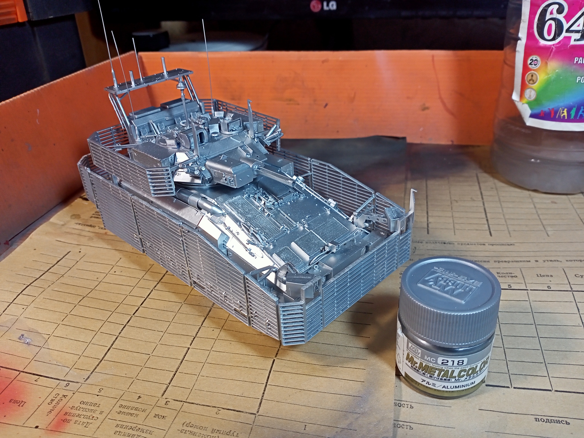 В качестве грунтовки я задул всю модель (кроме замаскированной ходовой и приборов наблюдения, конечно) цветом Mr.Metal Color Aluminium. Он прекрасно перекрыл все травлёные и пластиковые детали, к тому же сам танк в оригинале алюминиевый, потому если образуется скол краске, пускай в него выглядывает алюминий, а не другой цвет.
