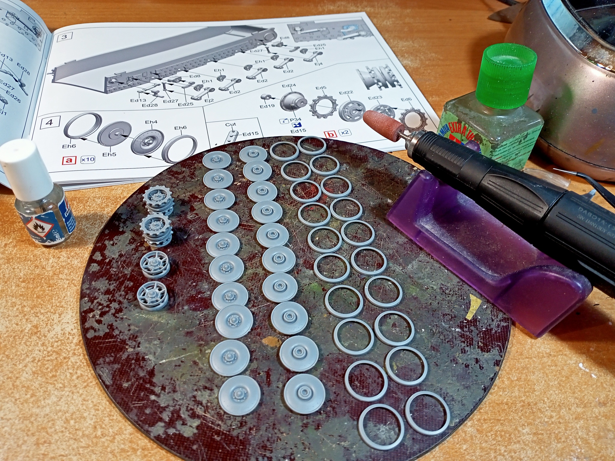 О создании: Сборка начинается с ходовой, тут уже видна забота о моделисте и сложность набора. Бандажи катков даны отдельными деталями для удобства покраски и для достоверности. Механическая обработка деталей маникюрным фрезером с полировочными головками, маникюрными пилками и скальпелем. Склеивал обычным и сверхтекучим модельным клеем. Для травления и антенн - цианоакрилат-гель.