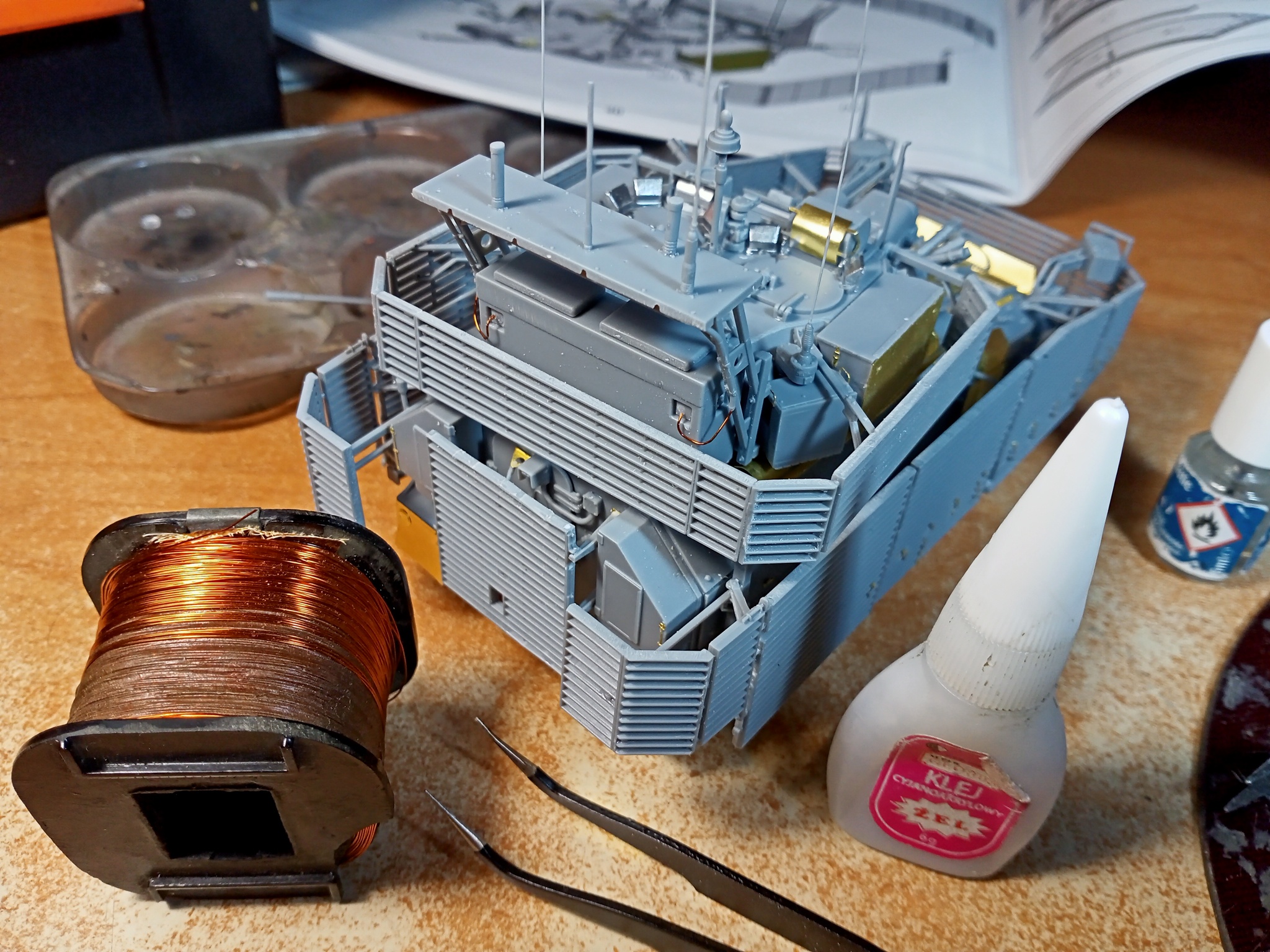 ...и много мелочей на неё. Задние части приборов наблюдения окрашены серебрянкой. Антенны выполнены из тянутого литника, ибо мой любимый кошачий ус в данном случае был бы тонковат.