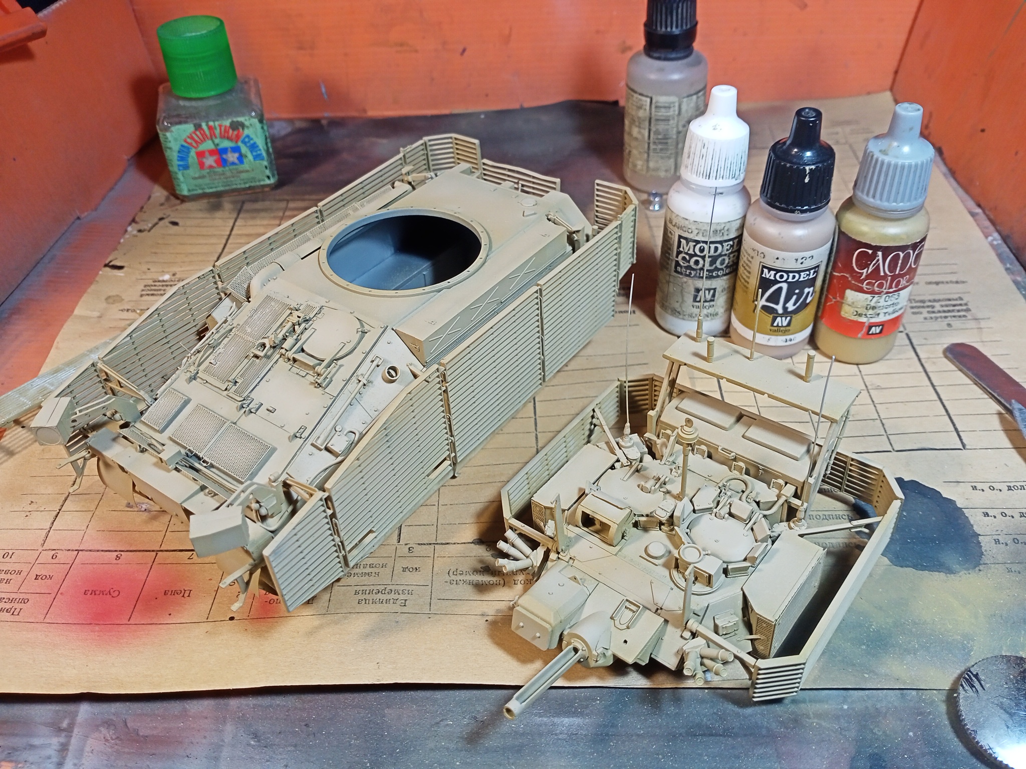 песочный из смеси акрилов Vallejo Air US Desert Tan и Vallejo Game Desert Yellow. Высветления - той же смесью с каплей белой краски. Не столько было сложно окрасить корпус за экранами, сколько сами экраны равномерно и без пропусков.