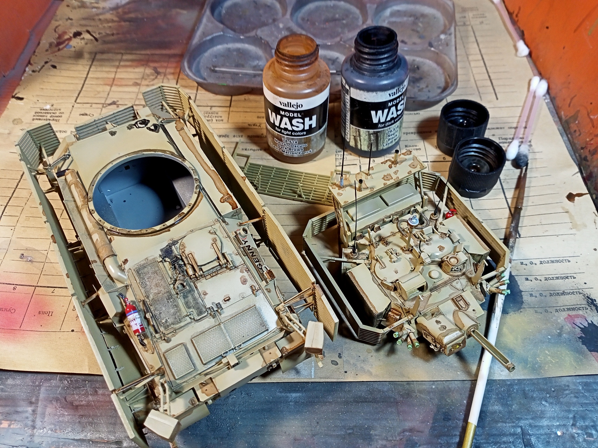 Немного акриловой смывки Vallejo Wash чёрного и светло-коричневого цветов. Ориентируясь на те же фото, машину стоит делать фактически чистой, потому обгадинга будет минимум.