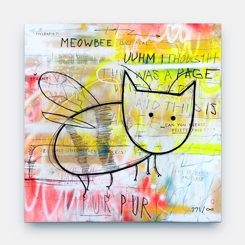 Они исполнены аэрозольными красками, маркерами, карандашами и ручками на холсте, размером 90 на 90 сантиметров. Нужно упомянуть, что это уже третья интерпретация картины CYBERCHONK 2077, одна из них, на сколько помню, находится в Германии, вторая где-то во Франции или Лос Анджелесе. В свою очередь первая версия CATBEE была вручена президенту Латвии, а вторая версия, как я уже упомянул, нашла новый дом в Словакии.