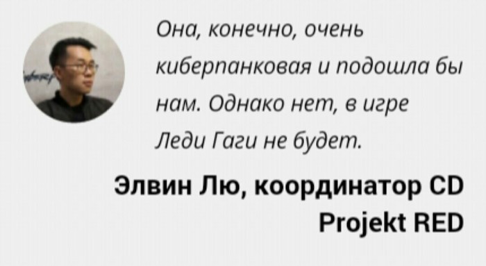 Вдобавок CD Projekt RED опровергла слухи о появлении в игре Леди Гаги.