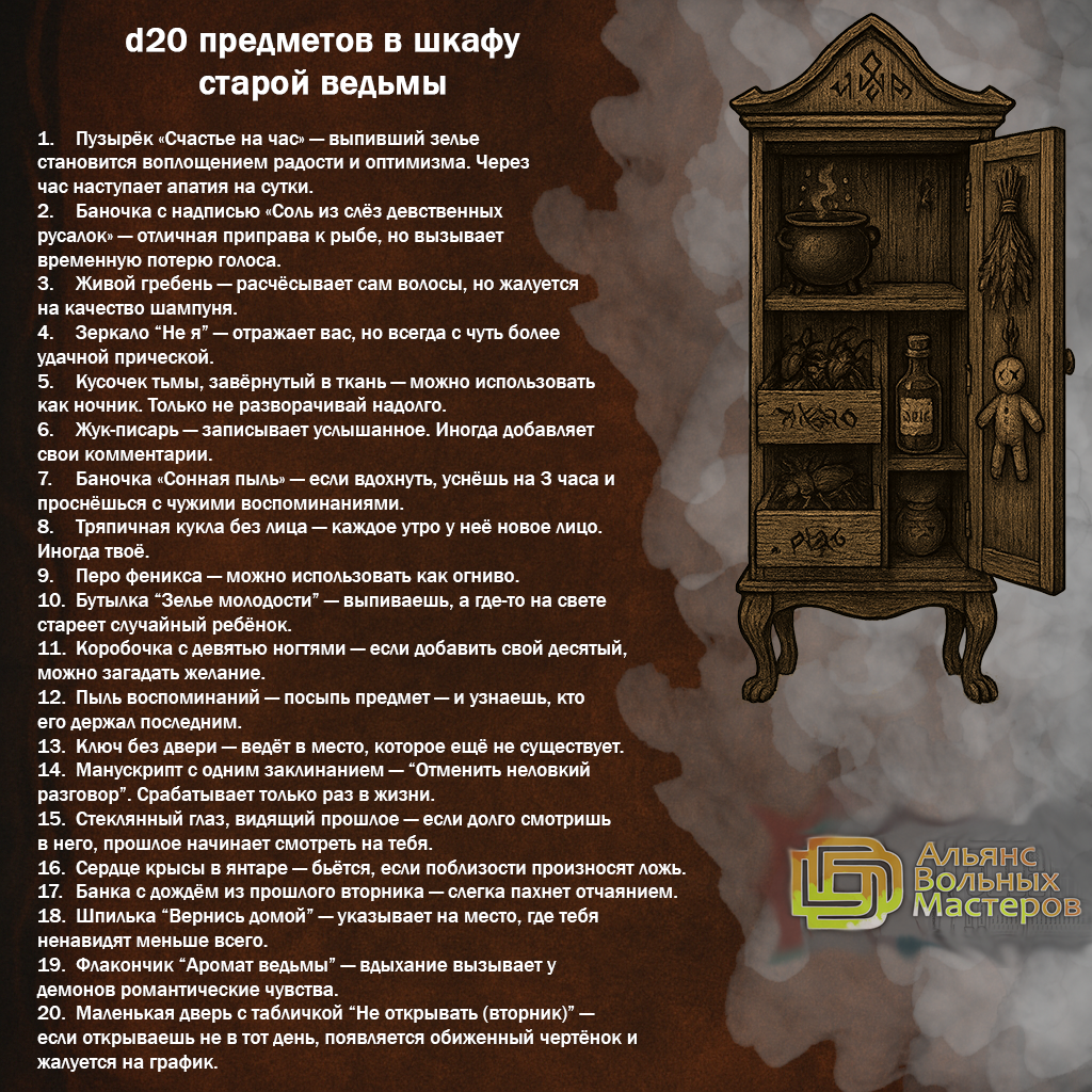 13 Susliche АЛЬЯНС ВОЛЬНЫХ МАСТЕРОВ D20 предметов в шкафу старой ведьмы 18 часов назад [моё] Dungeons & Dragons DnD 5 Настольные ролевые игры Наше НРИ Лут Ведьмы Ещё 0